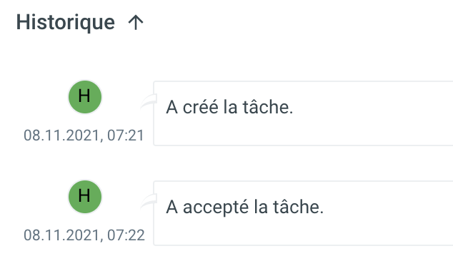 | L'historique des tâches répertorie toutes les activités qui ont eu lieu jusqu'à présent en rapport avec cette tâche. En cliquant sur la flèche, l'entrée la plus récente ou la plus ancienne est affichée en premier. ![]() |