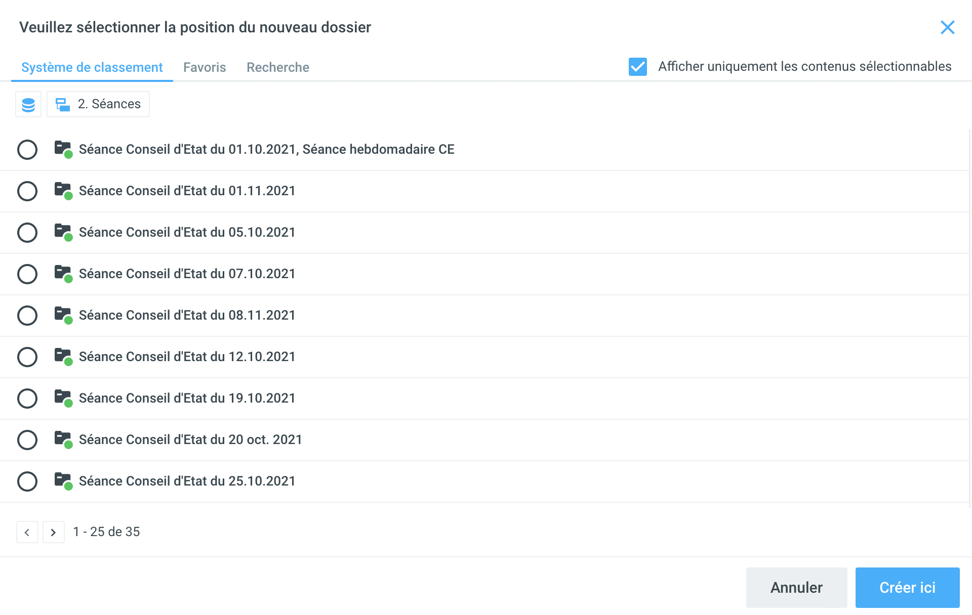 Si vous sélectionnez cette option, la première étape consiste à sélectionner l'élément de dossier sous lequel le nouveau dossier doit être créé.