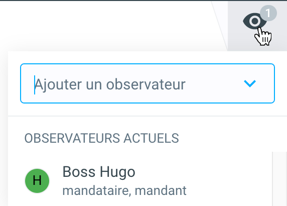 Par défaut, le mandant et le mandataire sont définis comme observateurs d'une tâche. Il est possible ici d'ajouter d'autres observateurs. Ceux-ci sont informés en conséquence (en fonction des paramètres de notification personnels des personnes concernées) en cas de changement d'état dans cette tâche. Toutes les tâches observées sont répertoriées sur le tableau de bord personnel de l'observateur.
