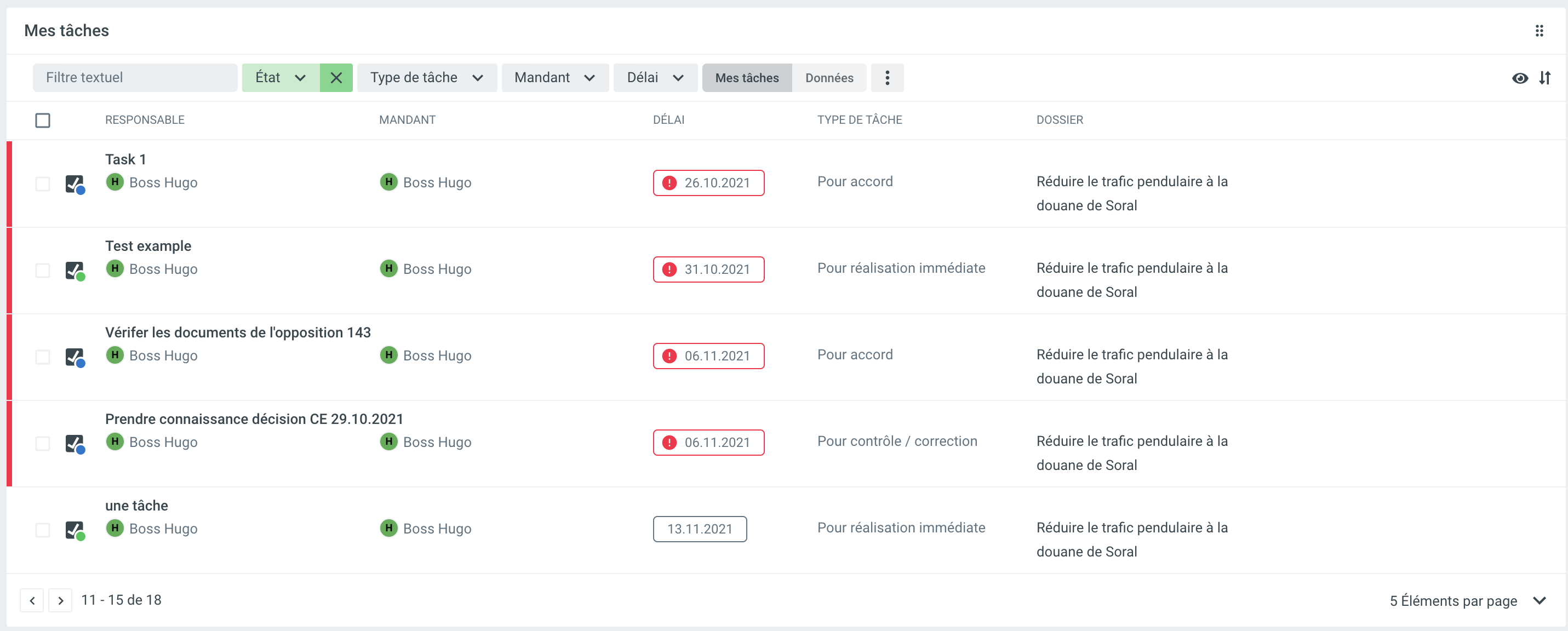 Les filtres supplémentaires peuvent être utilisés pour basculer entre les catégories Responsable et Mandant. Les tâches en retard sont marquées en rouge au début de la ligne et dans la colonne Responsable.