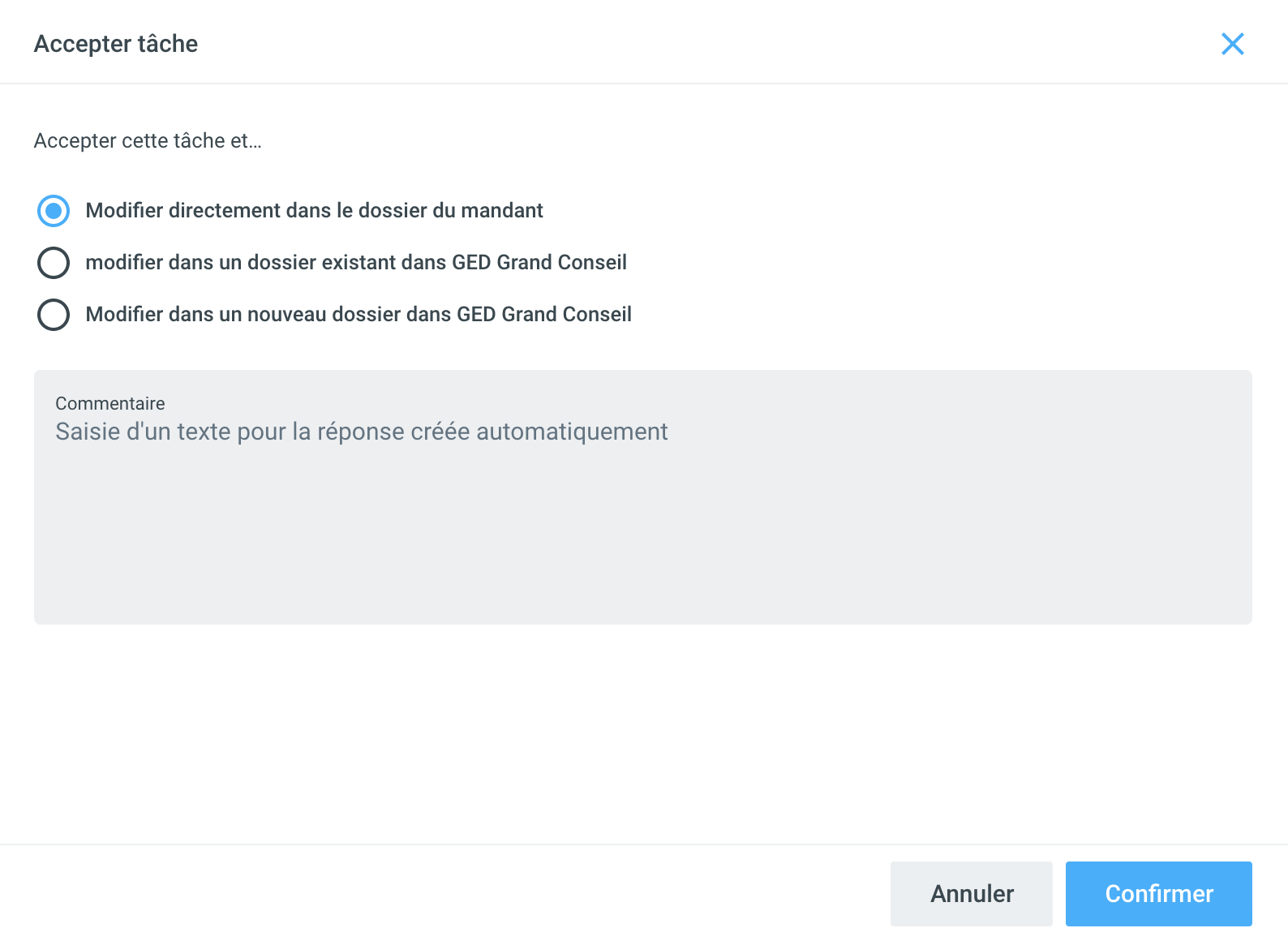 OneGov GED va maintenant suggérer trois façons de traiter la tâche :
