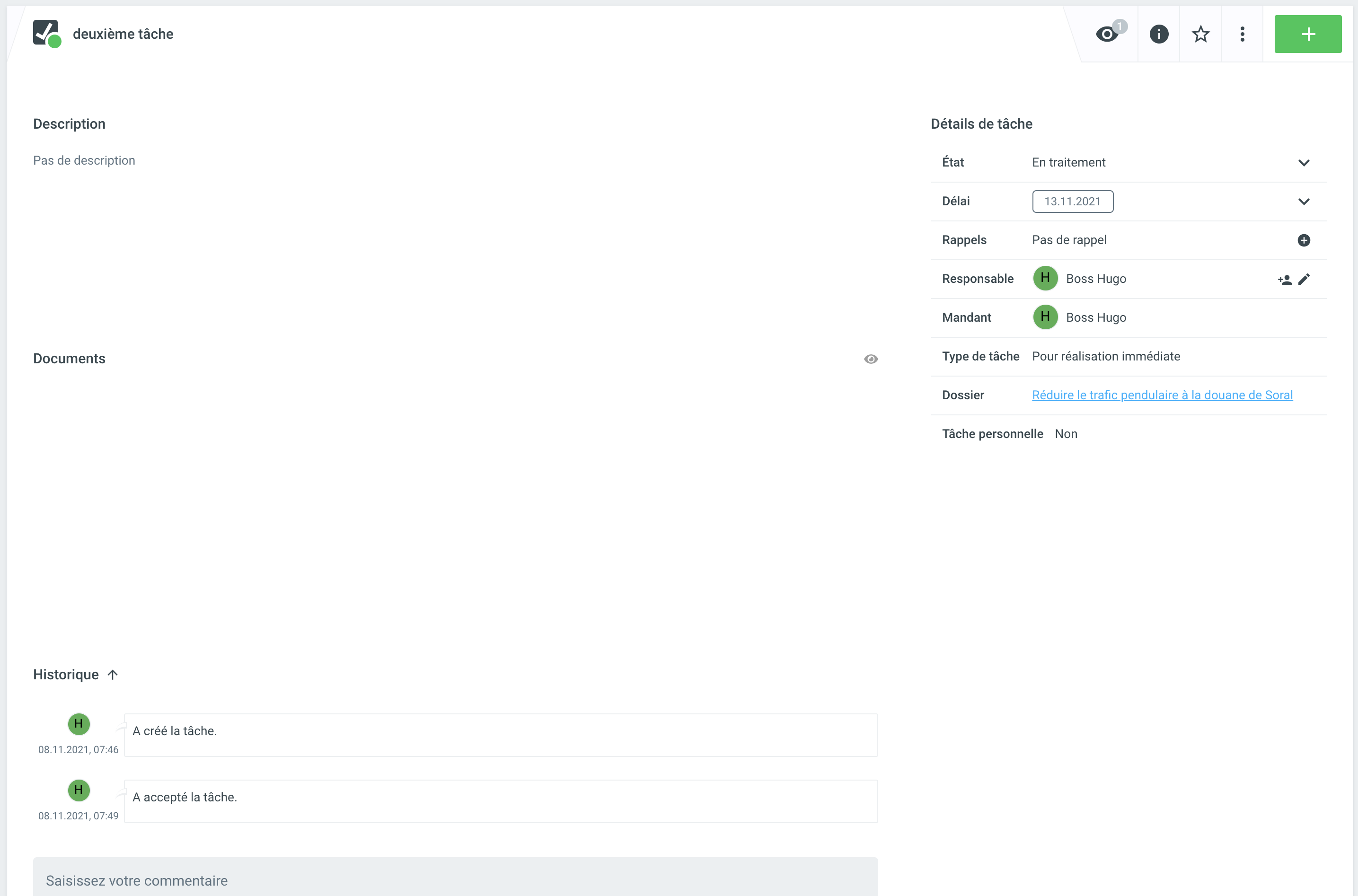 Si un mandataire accepte la tâche, il prend en charge la tâche. Si nécessaire, un commentaire peut être ajouté. Le statut passe d'Ouvert à En cours.