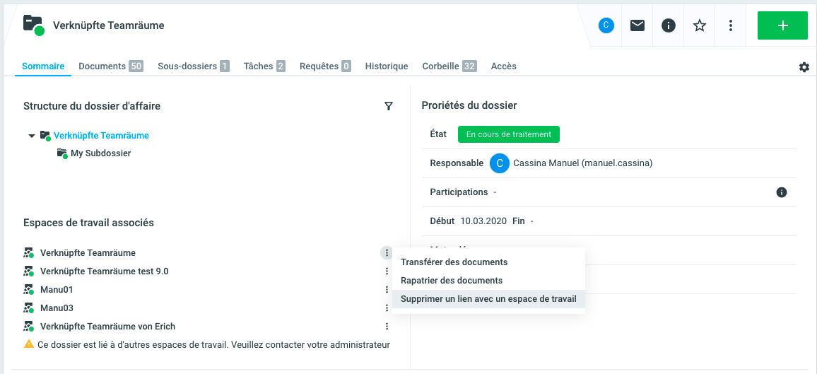 Après avoir fermé ou annulé un dossier avec des espaces d'équipe liés, les liens vers les espaces d'équipe doivent être supprimés manuellement. Ce n'est qu'alors que les espaces collectifs qui ne sont plus utilisés peuvent être supprimés.