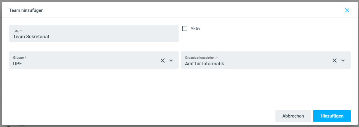 Um ein Team zu erstellen, klicken Sie auf den Bereich Verwaltung und dort auf die Kachel Teams. Über das + können Sie ein Team hinzufügen. Füllen Sie dazu alle benötigten Felder aus. Wir empfehlen dabei, Teams immer mit dem Präfix Team zu versehen. So ist es für die Mitarbeitenden einfacher, die Teams in den Auftragnehmerauflistungen zu finden.