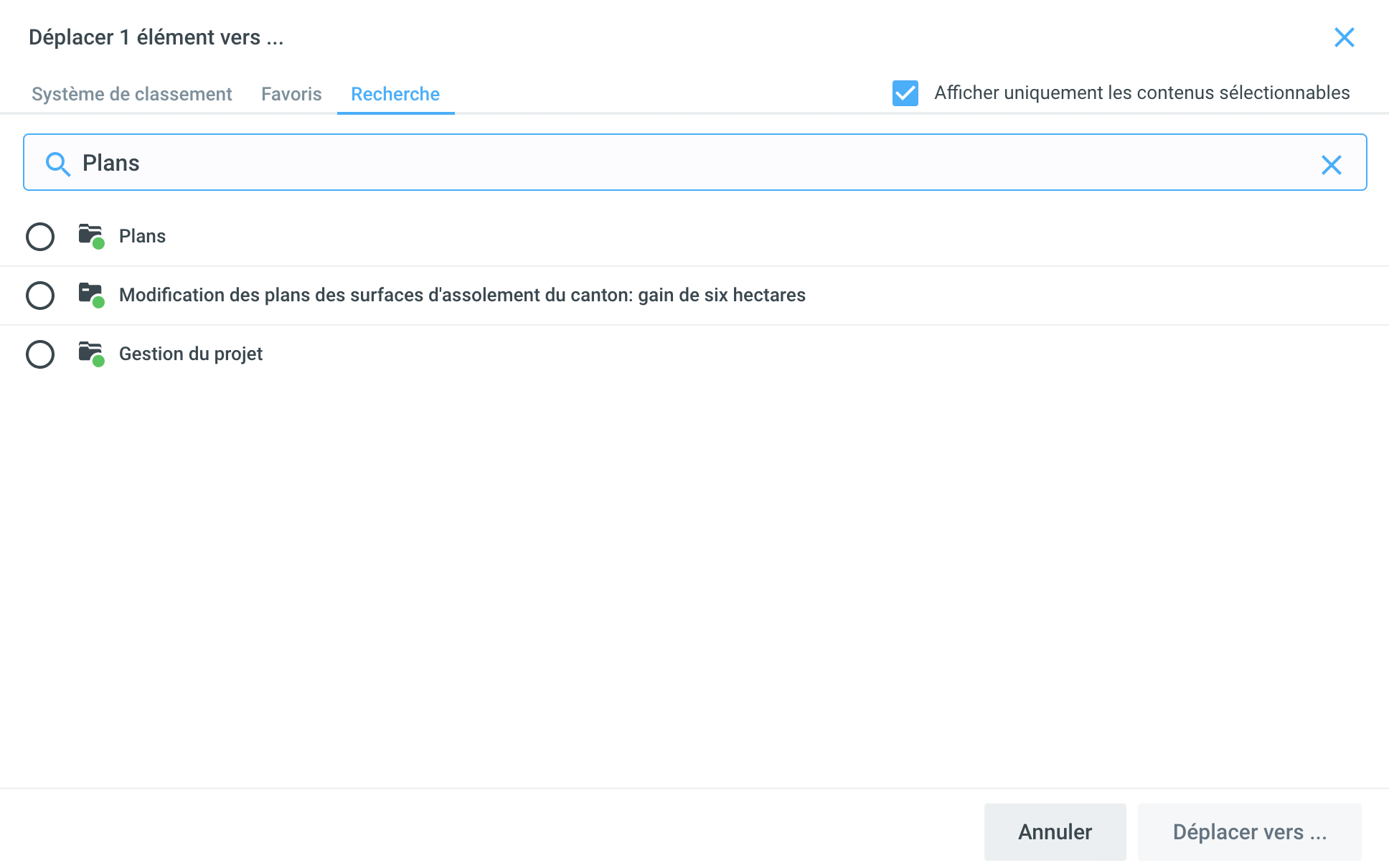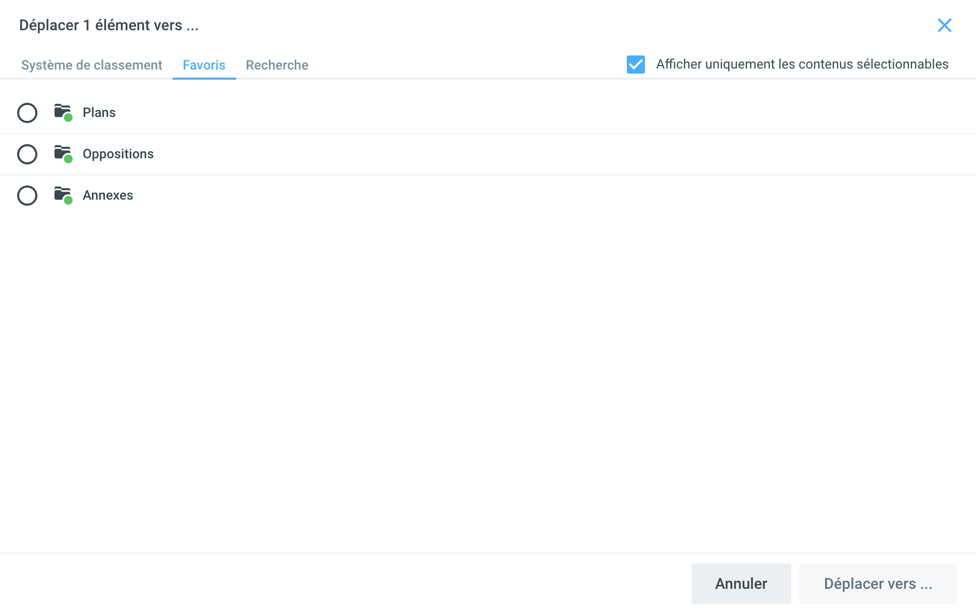 Par ailleurs, en sélectionnant l'onglet Favoris, il est également possible de déplacer les objets vers des destinations que vous avez sélectionnées comme favorites.