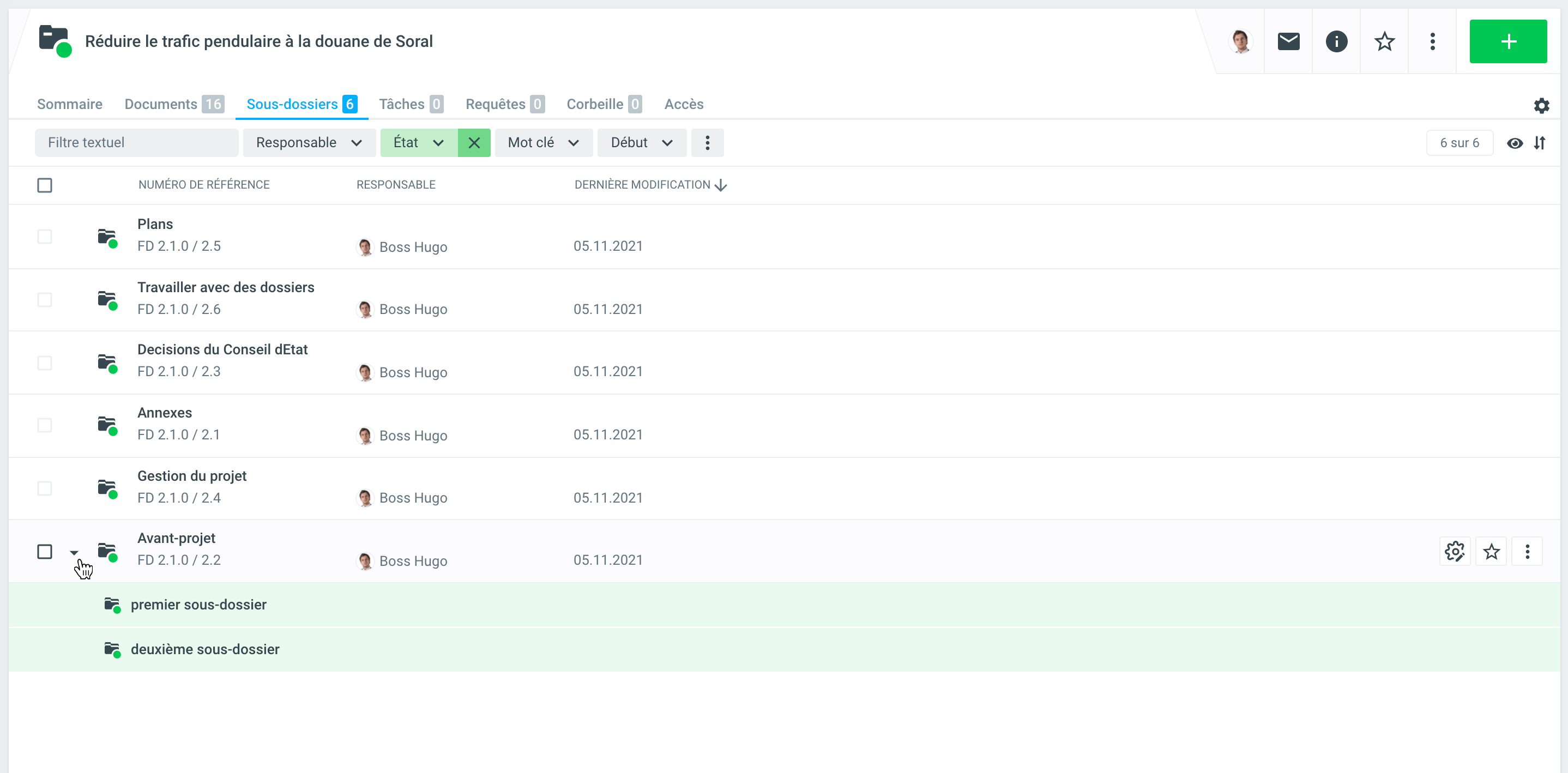 Sélectionnez + et sous-dossier sur le dossier principal Créer un dossier. Le responsable est automatiquement repris du dossier principal, mais il peut être modifié. Un nombre quelconque de niveaux d'imbrication de sous-dossiers peut être ouvert sous un dossier principal (selon la configuration) ; par défaut, cependant, cela est limité à un seul niveau hiérarchique.