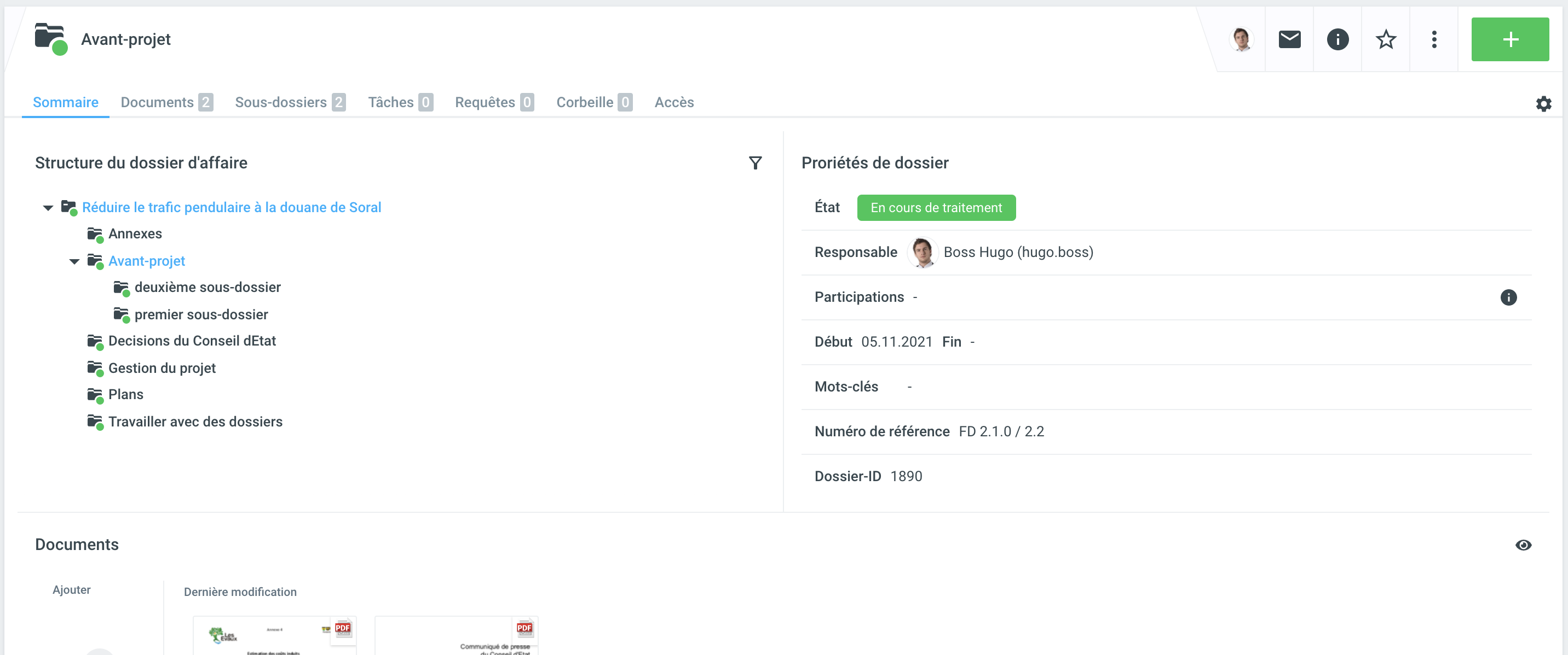Le dossier ou la structure de l’affaire est affiché dans la vue d'ensemble d'un dossier. Les sous-dossiers sont affichés avec l'icône correspondante quel que soit leur statut.