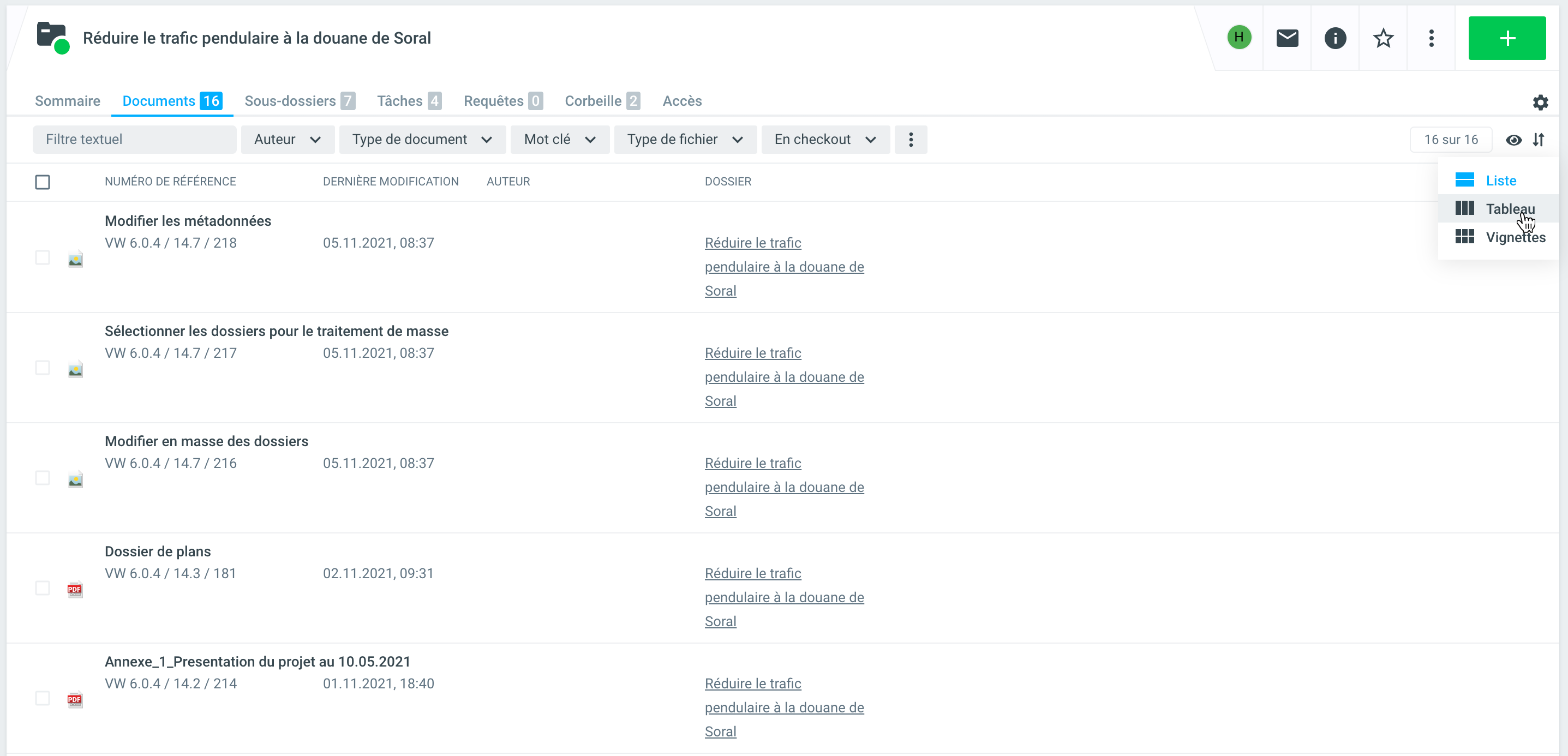 Il est possible de voir si les éléments respectifs (documents, tâches, demandes, etc.) sont classés dans des sous-dossiers ou non au niveau du dossier principal sous l'onglet correspondant (par exemple, Documents) en utilisant la vue Tableau :