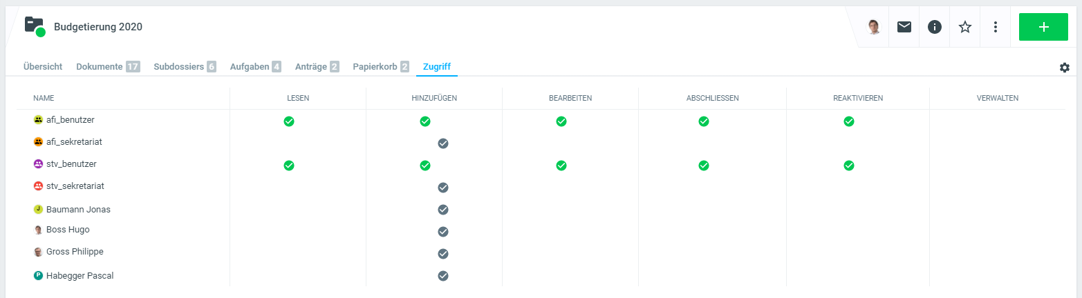 Unter dem Reiter Zugriff ist ersichtlich, welche Gruppen auf das Dossier Zugriff haben.