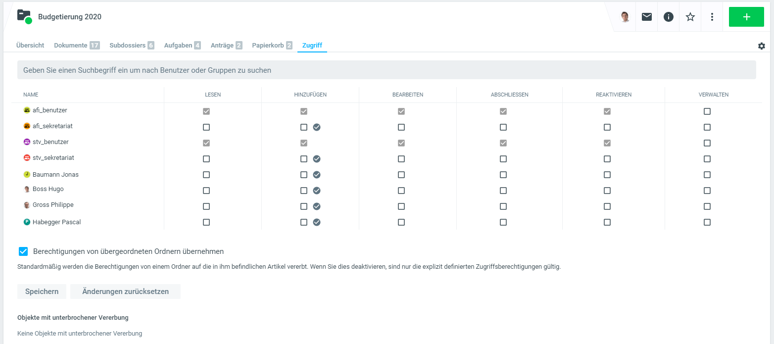 Die Anpassung von Berechtigungen ist bei grossen Dossiers oder Rubriken mit vielen angehängten Dossiers sehr ressourcenintensiv. Benutzen Sie diese Funktionalität bitte entsprechend zurückhaltend.