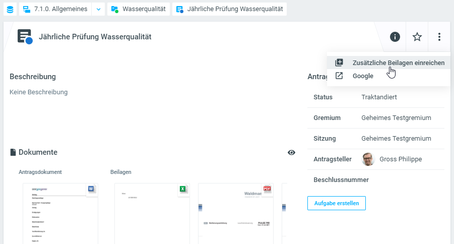 Bei bereits traktandierten Anträgen können im Bedarfsfall über die drei Punkte (=weitere Aktionen) zusätzliche Beilagen eingereicht werden.