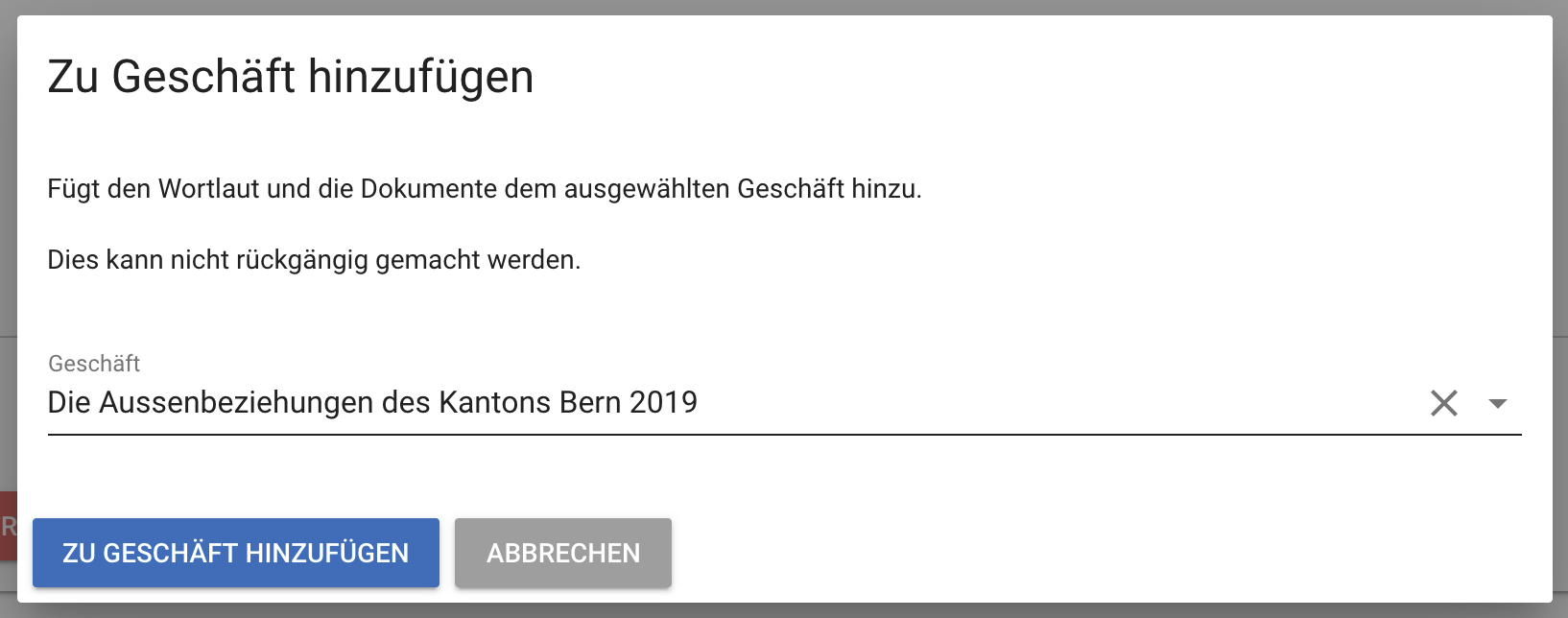 Die Aktion Zu Geschäft hinzufügen öffnet ein Modal in dem das zugrundeliegende Geschäft ausgewählt werden kann.