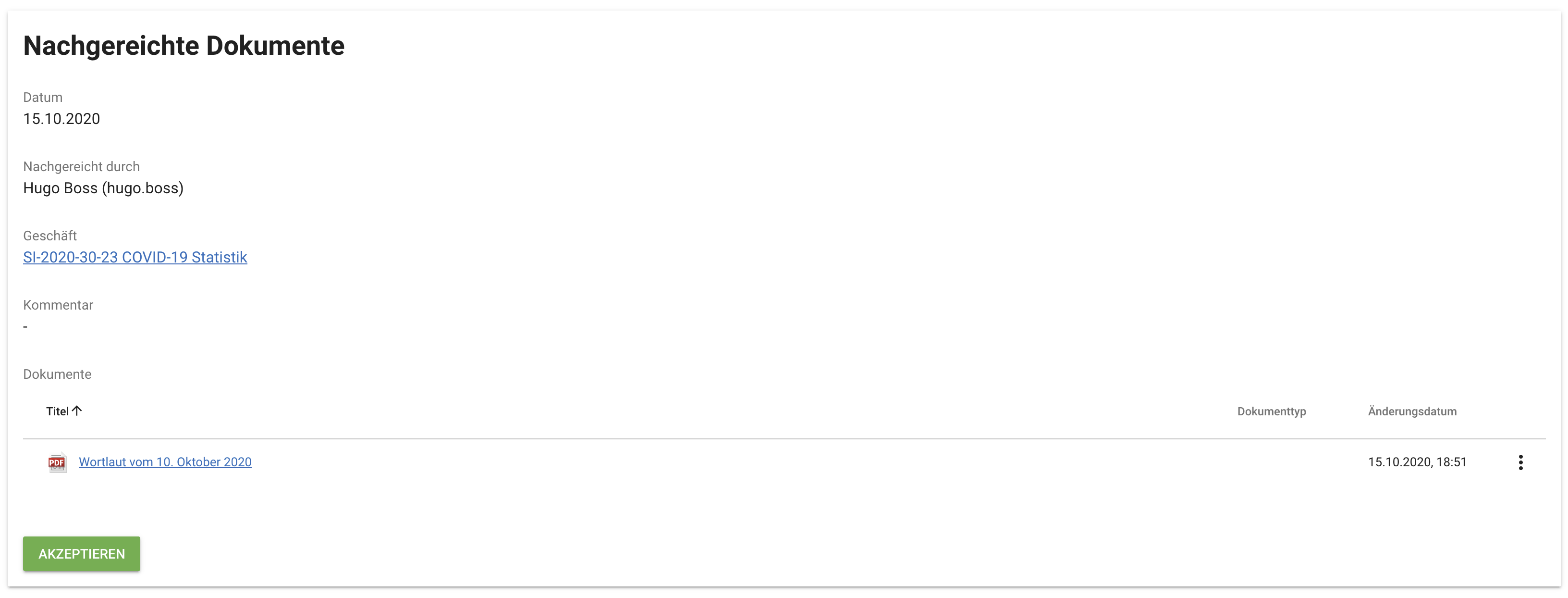 Durch Akzeptieren des nachgereichten Dokumentes wird das Dokument dem bestehenden Geschäft beigefügt.