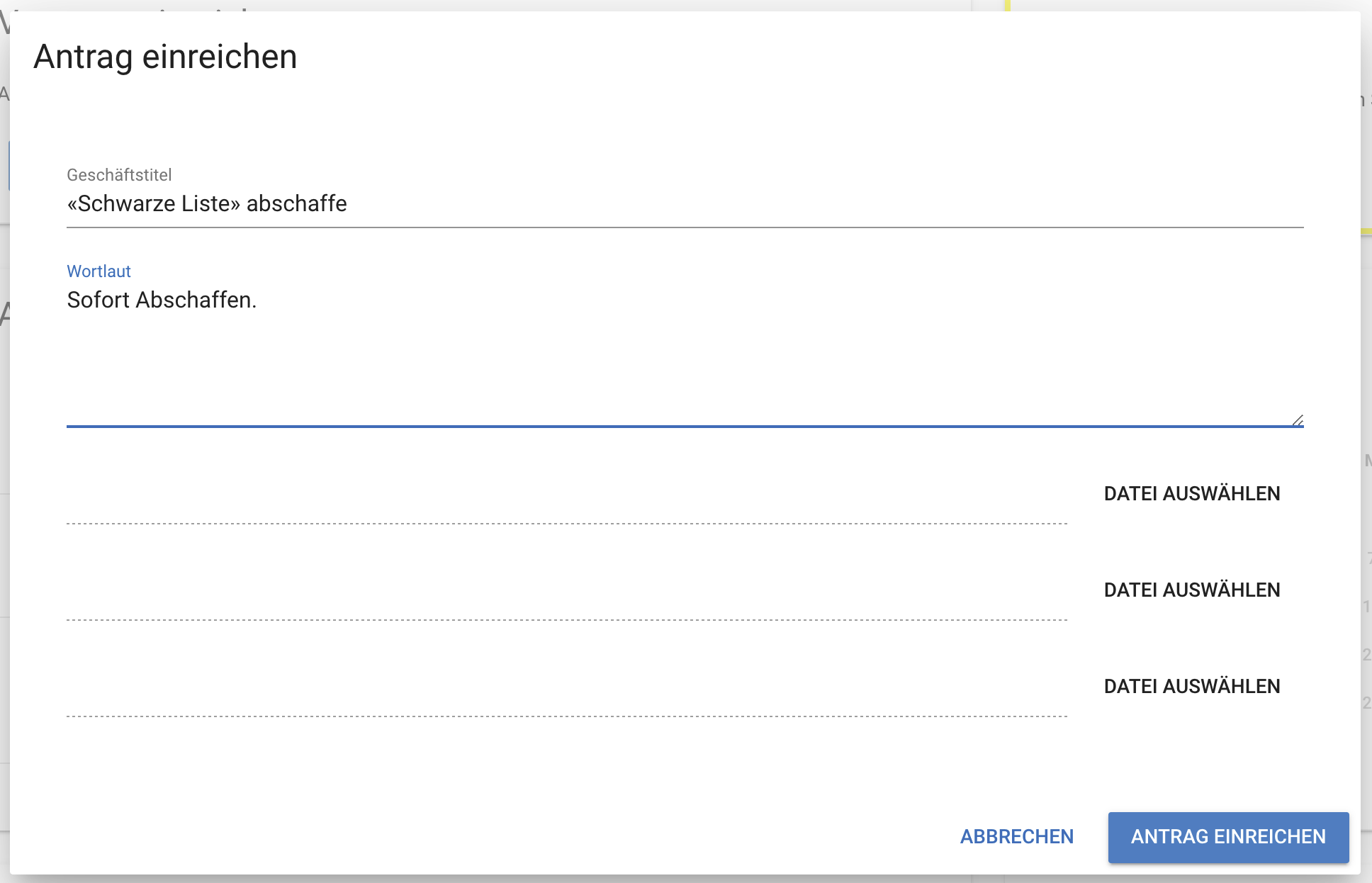 Die Aktion Antrag einreichen führt den Benutzer in ein Modal mit einer neuen Maske. Dem Antrag kann eine Geschäftstitel, ein Wortlaut und eine oder mehrere Dateien mitgegeben werden.