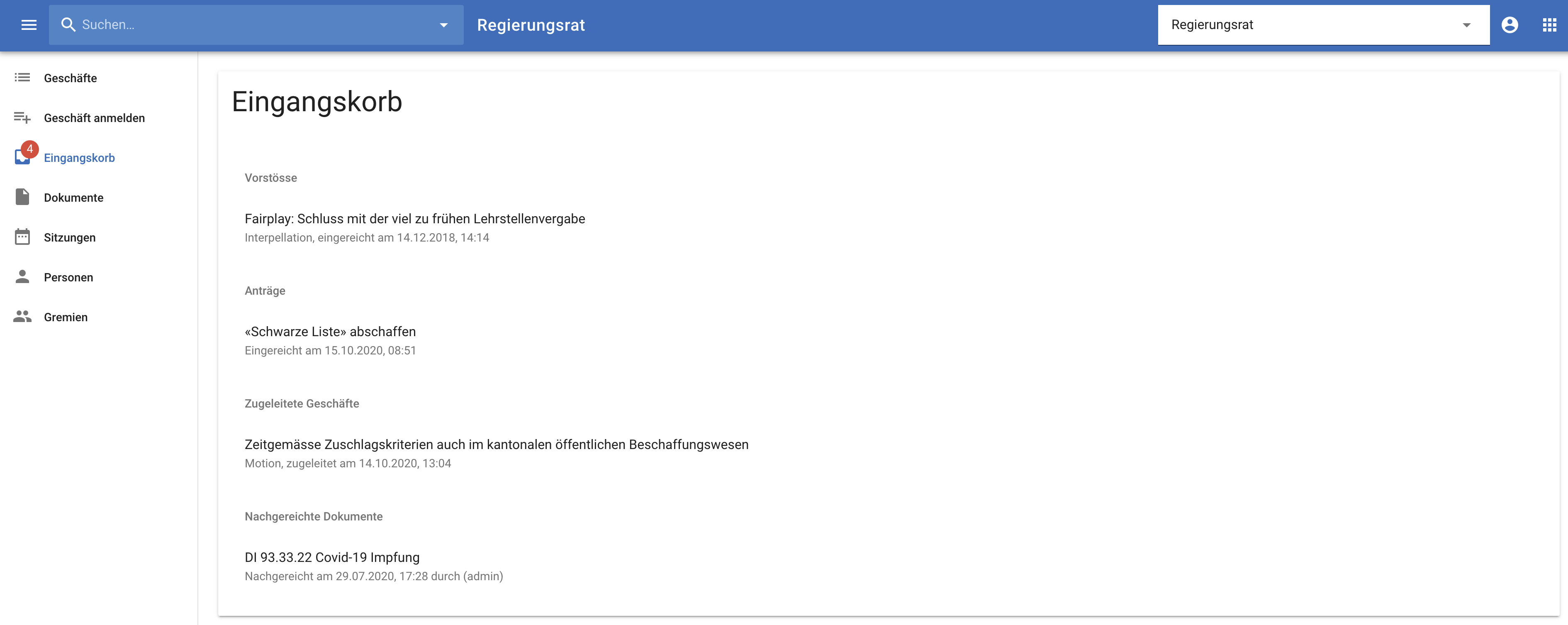 L'élément de menu Boîte de réception sert de boite de réception pour les affaires transmises par le Parlement, les motions et propositions de l'application de session ainsi que les documents déposés ultérieurement pour une affaire existante.