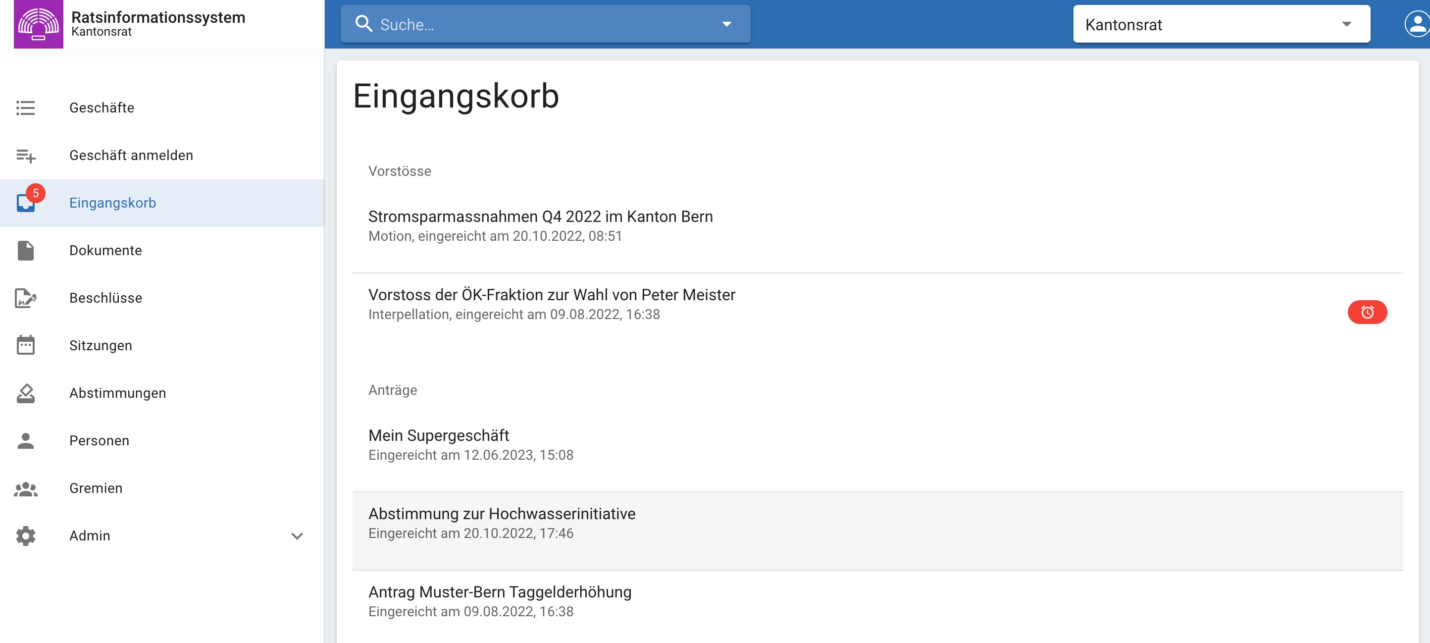 Der Menüpunkt Eingangskorb dient als Auffangbecken für zugeleitete Geschäfte aus dem Parlament, Anträge und Vorstösse aus der Sitzungs-App sowie nachgereichte Dokumente zu einem bestehenden Geschäft.