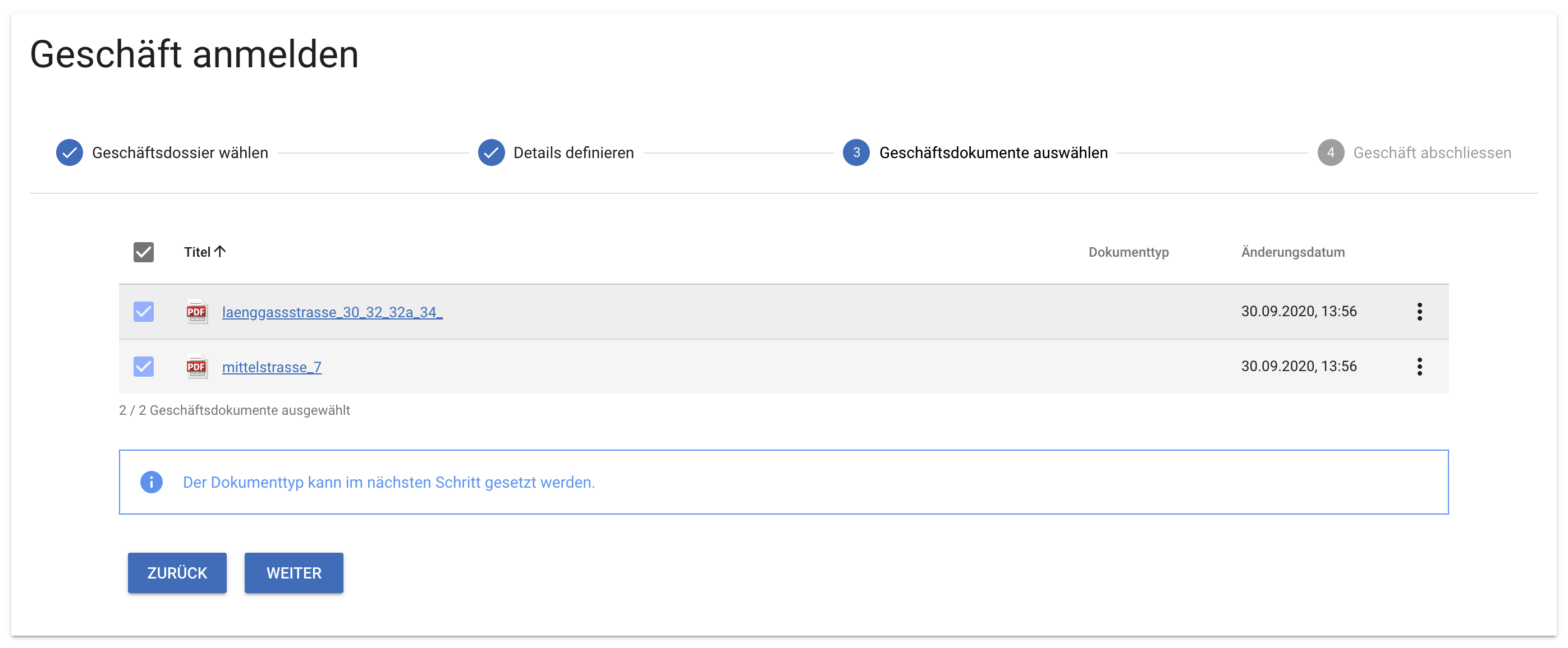 Im letzten Schritt wird eine Übersicht der getätigten Anmeldeschritte angezeigt. Zusätzlich kann in diesem Schritt der Dokumenttyp pro Dokument hinterlegt werden. Hier gilt es zu beachten, dass nur die Dokumenttypen angezeigt werden, welche auch in GEVER vorhanden sind. Falls gewünscht kann auch der Titel des Dokumentes angepasst werden.