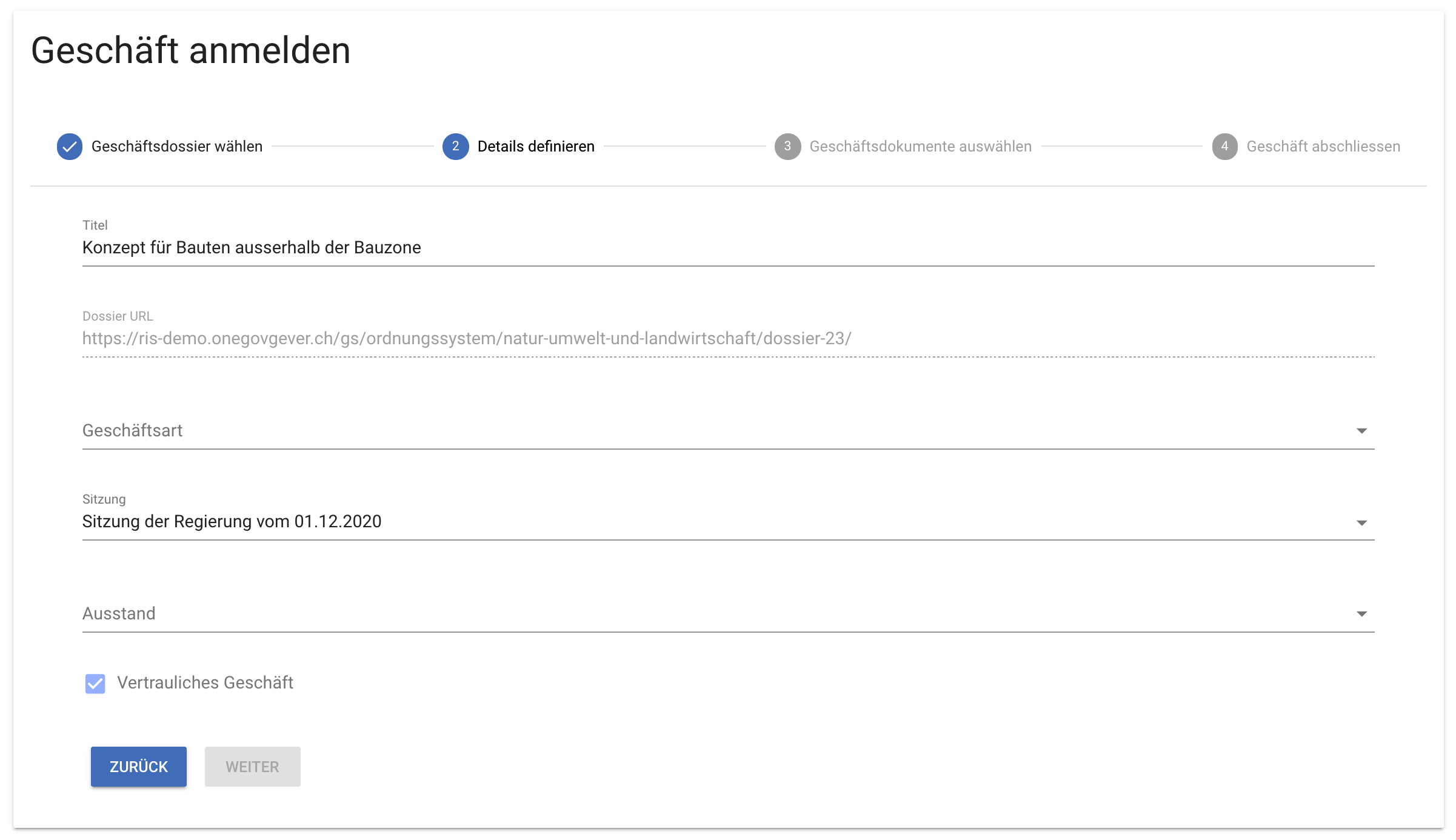 Als nächster Schritt können die Details des anzumeldenden Geschäftes eingetragen werden. Der Titel wird standardmässig vom Ursprungsdossier übernommen, kann jedoch bei Bedarf angepasst werden. Weiter müssen die Geschäftsart sowie die gewünschte Sitzung ausgewählt werden. Die nächste Sitzung wird automatisch vorgeschlagen. Ist keine Sitzung in der Zukunft vorhanden, kann auch keine Sitzung ausgewählt werden. Zusätzlich kann ein Geschäft als dringlich oder vertraulich markiert werden. Weiter kann ein Departement beispielsweise bei einem Personalgeschäft für den Ausstand ausgewählt werden.