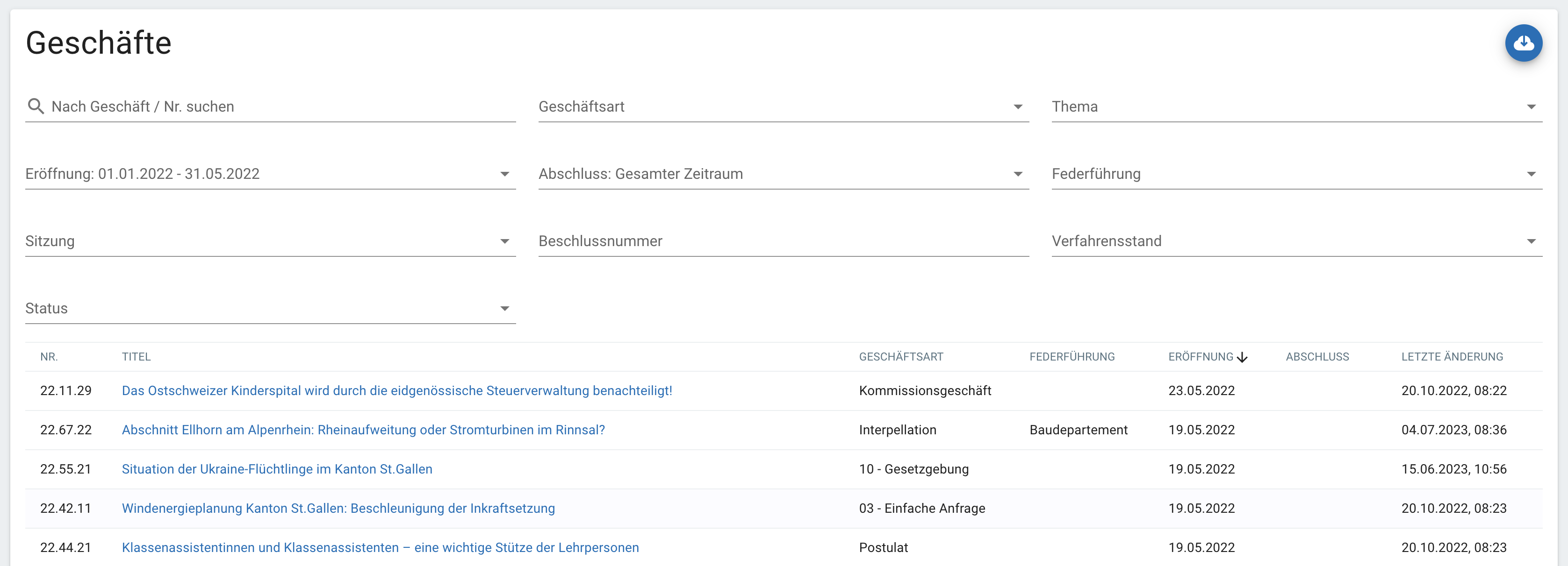 Im Bereich Geschäfte werden alle vorhandenen Geschäfte dargestellt. Es gibt eine Suche, in welcher nach den Attributen Titel und Geschäftsnummer gesucht werden kann. Weiter gibt es Filtermöglichkeiten nach Status, Thema, Geschäftsart, Federführung, Zuständige Person, Verfahrensstand und dem Zeitpunkt der Geschäftseröffnung. Die Listenansicht der Geschäfte bietet zudem eine Sortiermöglichkeit nach dem gewünschtem Tabellenkopf.