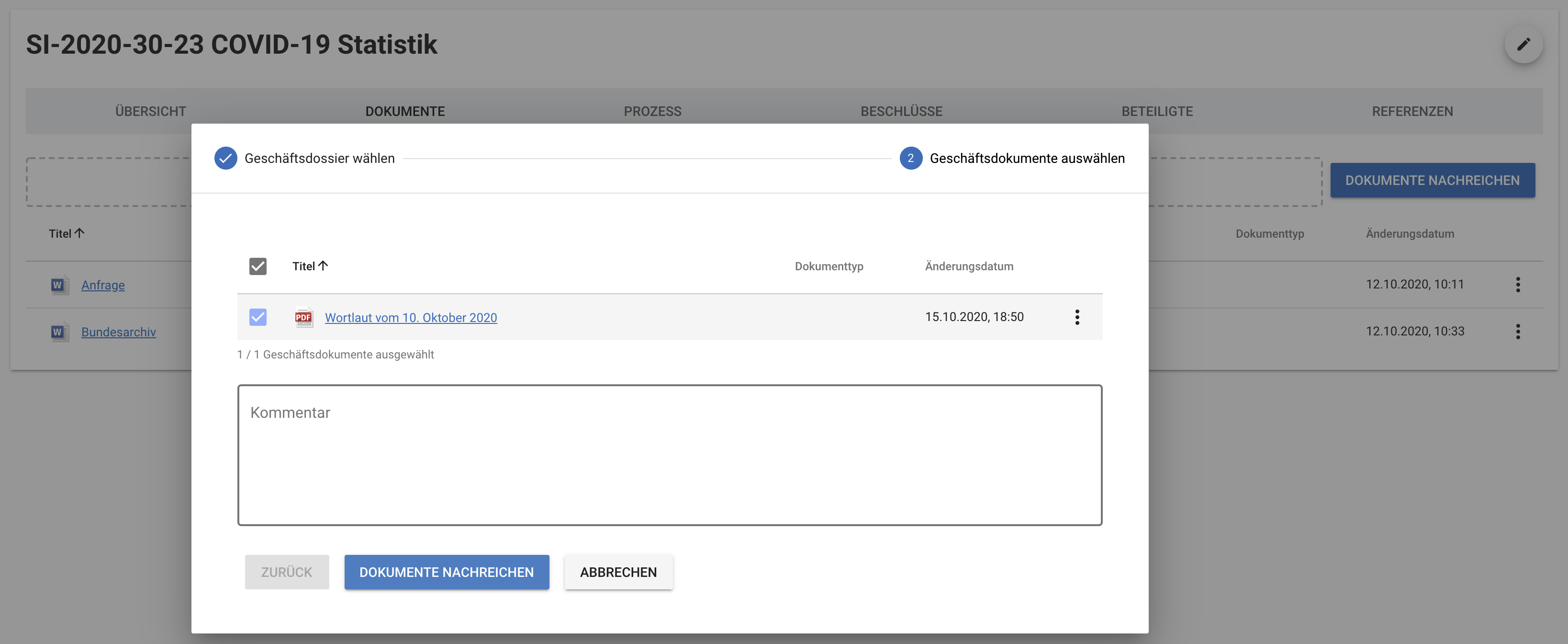 Über die Funktion Dokumente nachreichen können dem Geschäft nachträglich Dokumente aus dem Ursprungsdossier hinzugefügt werden.