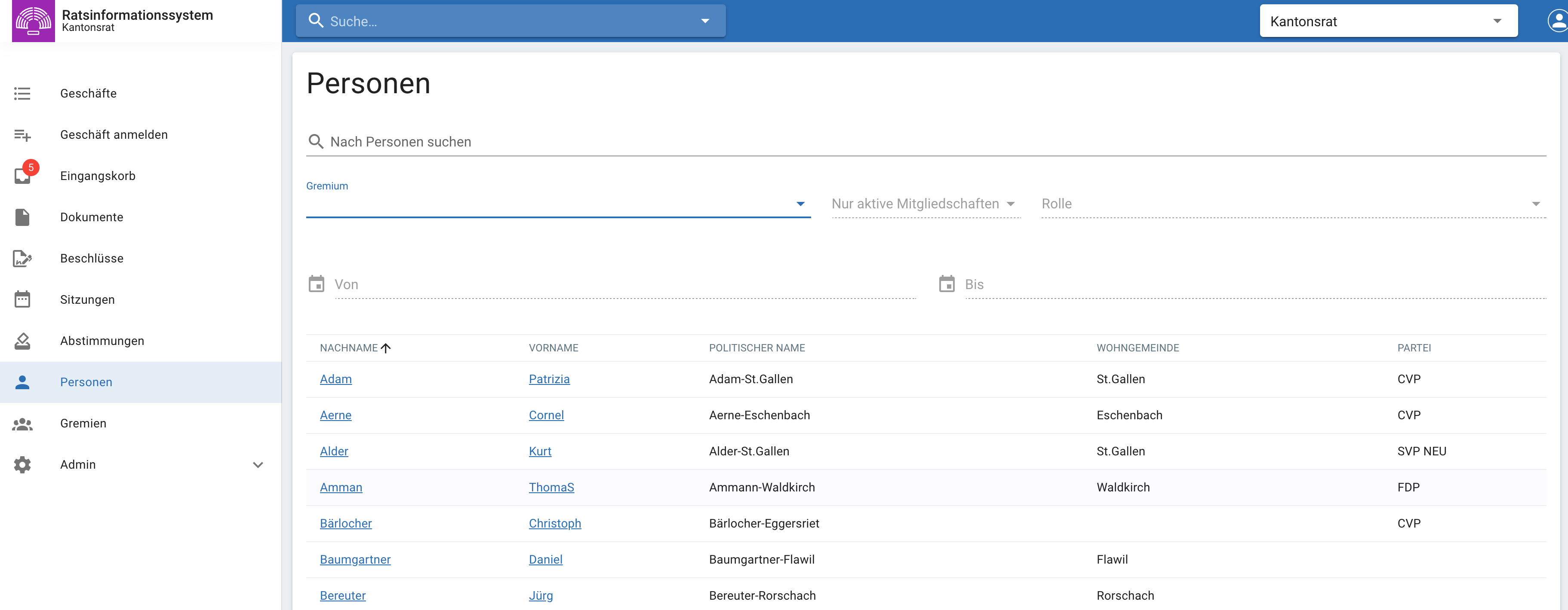 Der Bereich Personen listet alle Mitglieder des aktiven Gremiums auf. Die Personen können nach dem Namen gefiltert und über die Spaltenköpfe entsprechend sortiert werden.