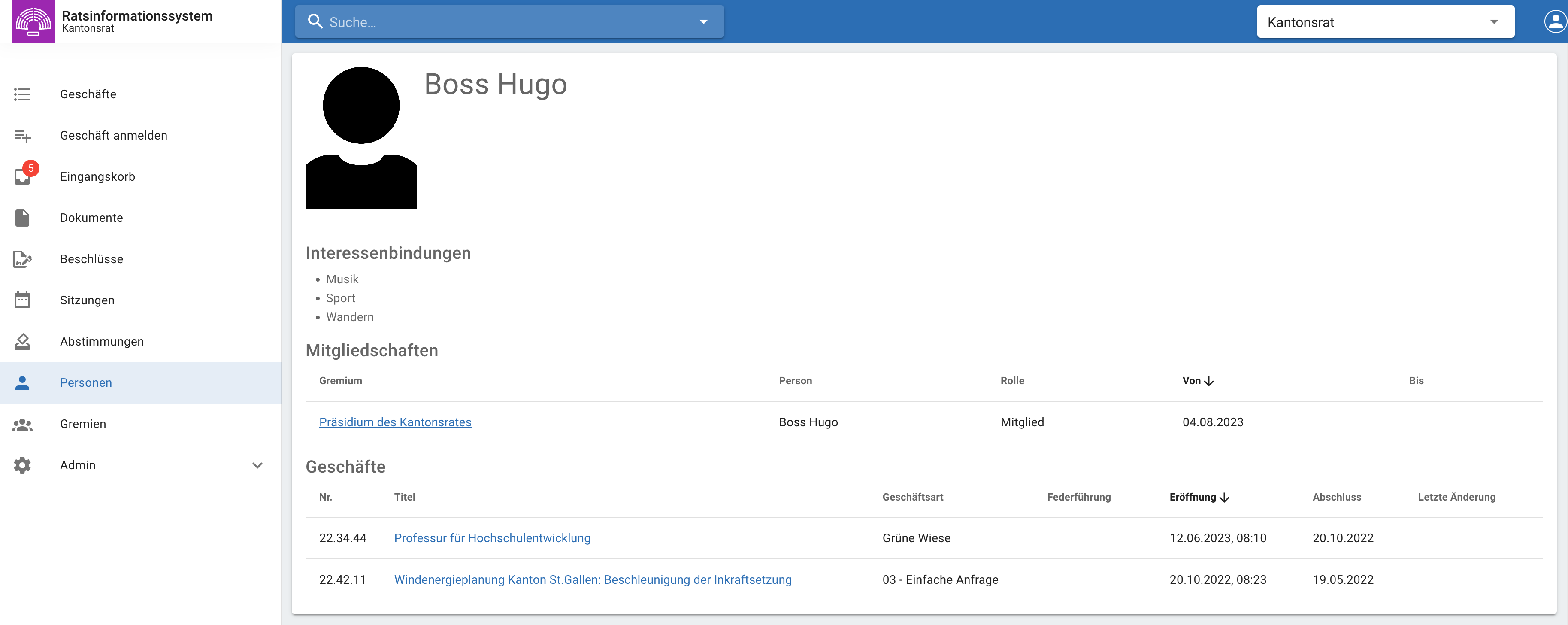 Auch die Person verfügt über eine Detailansicht. Hier findet man diverse private und berufliche Informationen. Zudem werden Interessensbindungen, Mitgliedschaften und Geschäft an welcher die Person beteiligt ist, angezeigt.
