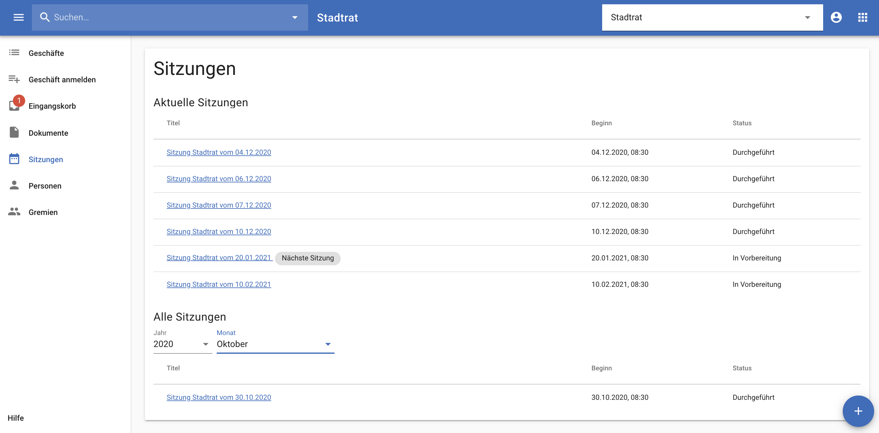 La section Séances énumère toutes les séances à venir et passées. Les séances peuvent être ajoutées via le symbole plus. Il est possible de saisir des séances d'un ou plusieurs jours. Une étiquette indique toujours à l'utilisateur la séance en cours et la séance suivante. Il est également possible de filtrer les séance d'une période spécifique dans la partie inférieure de la page.