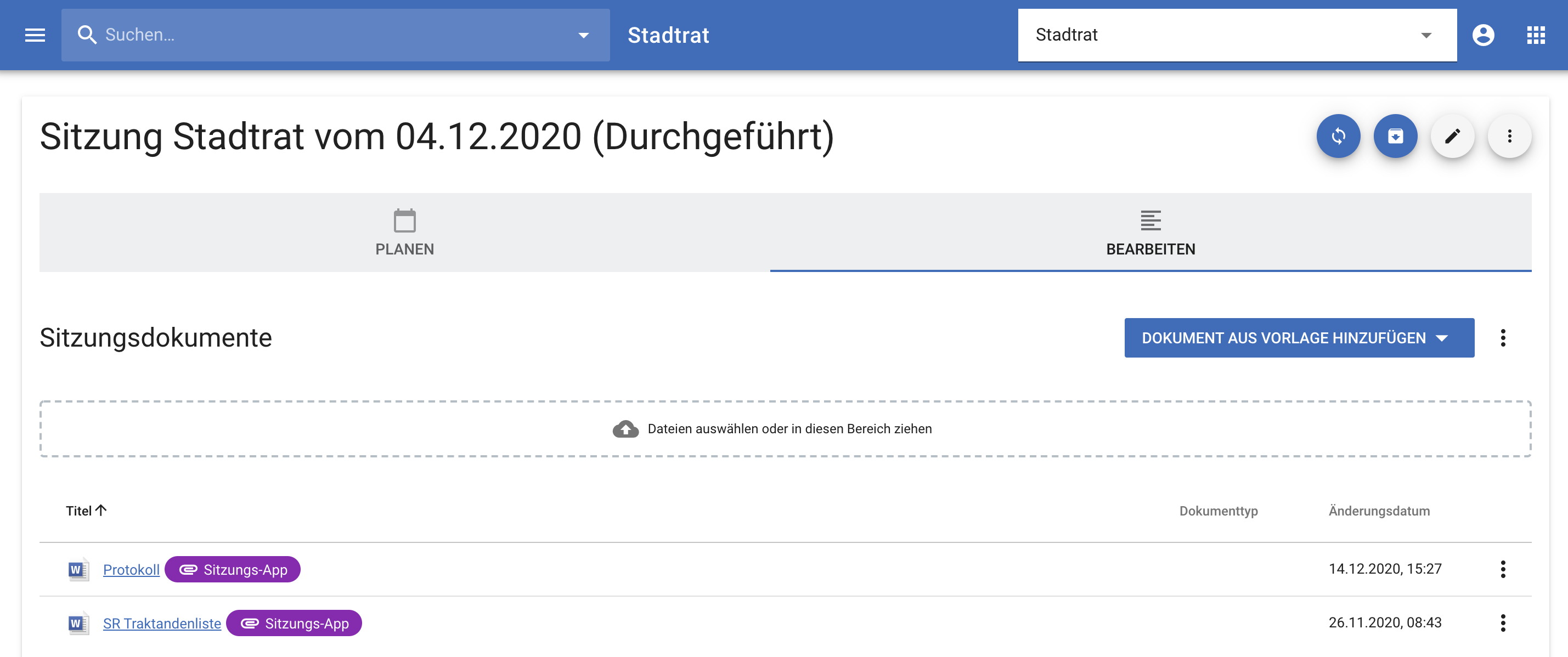 L'onglet Modifier est divisé en deux sections. La section supérieure contient les documents de séance. Il s'agit de documents indépendants de l'entreprise, tels qu'une liste d'ordres du jour ou un procès-verbal complet/préliminaire. Ces documents peuvent être créés par glisser-déposer ainsi qu'à partir d'un modèle.