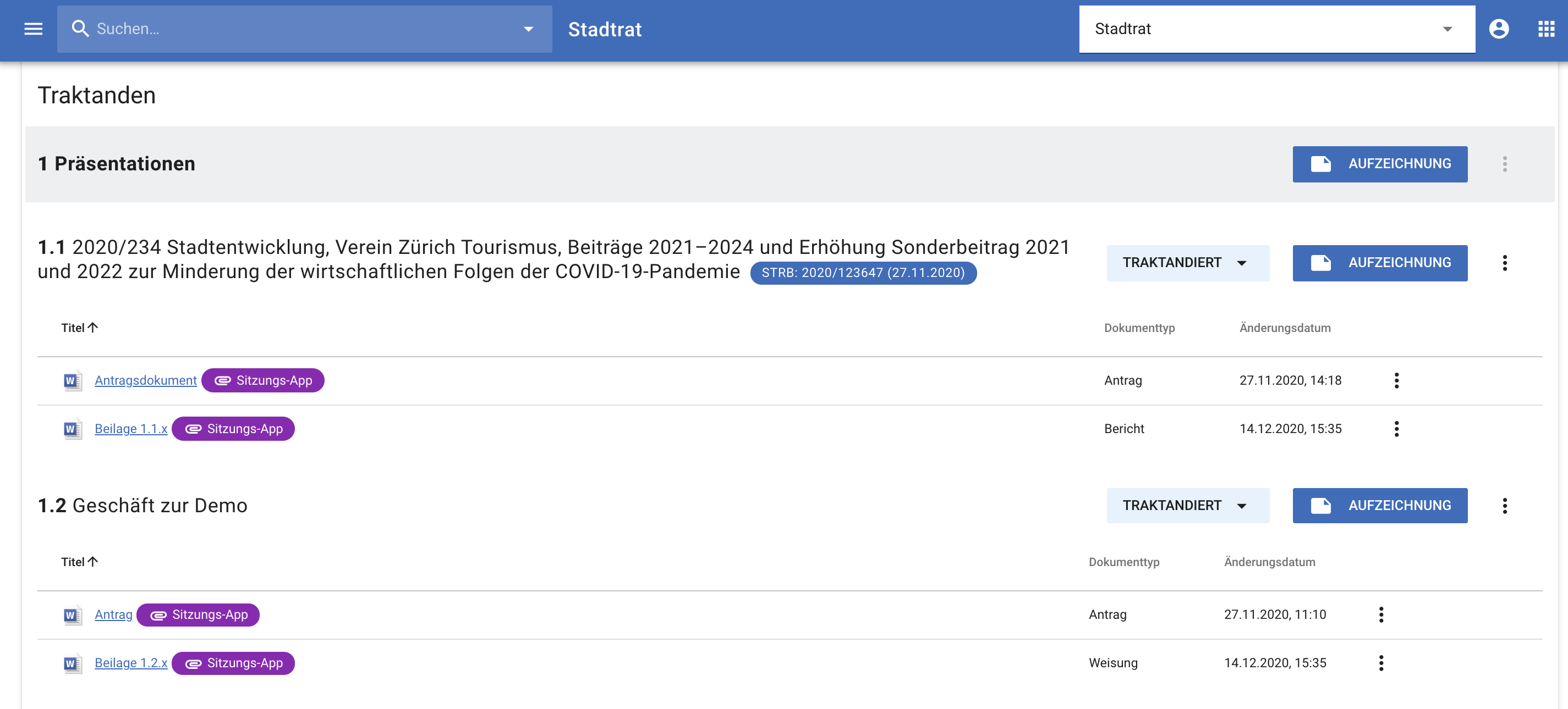 La deuxième section comprend les points individuels qui ont été ajoutés à l'ordre du jour de la séance correspondante. Nous distinguons ici les actions sur le point de l'ordre du jour et le document.
