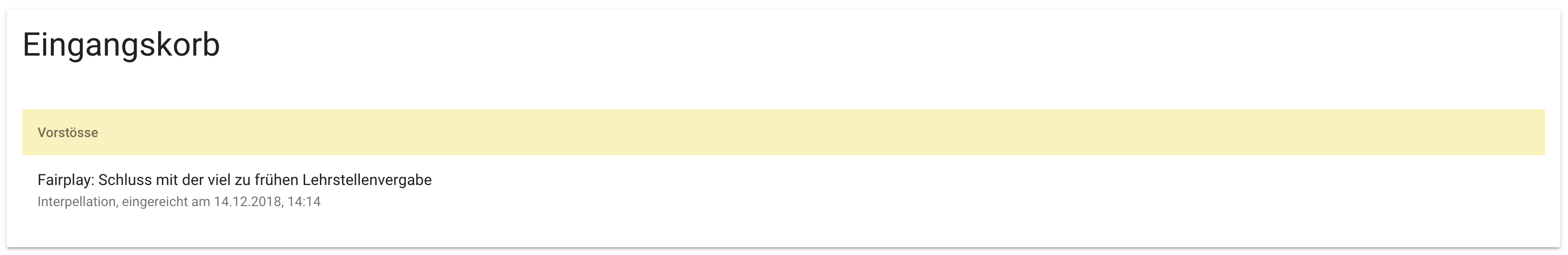 Der Vorstoss erscheint anschliessend im Eingangskorb im RIS. Für jeden Vorstoss wird eine kurze Vorschau mit den wichtigsten Metadaten angezeigt.