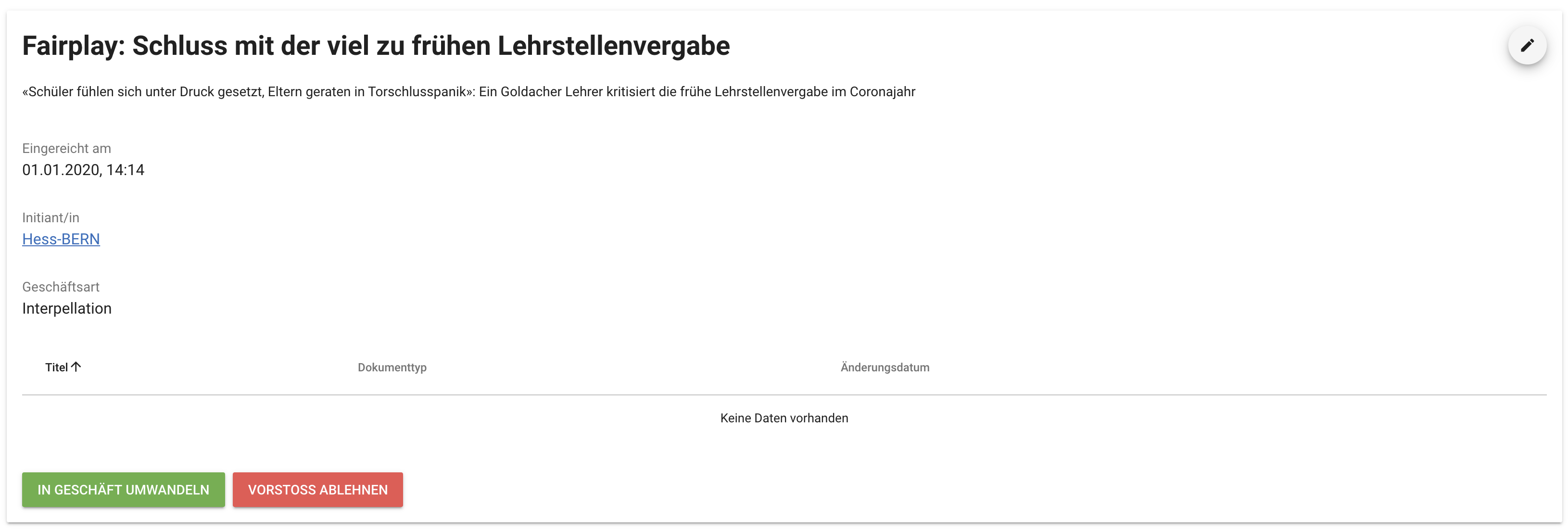 Jeder Vorstoss hat auch eine Detailansicht. Bei Bedarf können die Metadaten im Eingangskorb nachträglich noch bearbeitet werden. Nun kann der Vorstoss entweder angenommen oder abgelehnt werden. Durch die Aktion In Geschäft umwandeln wird der Vorstoss in ein Geschäft umgewandelt. Durch die Aktion Vorstoss ablehnen wird der Vorstoss aus dem Eingangskorb entfernt.