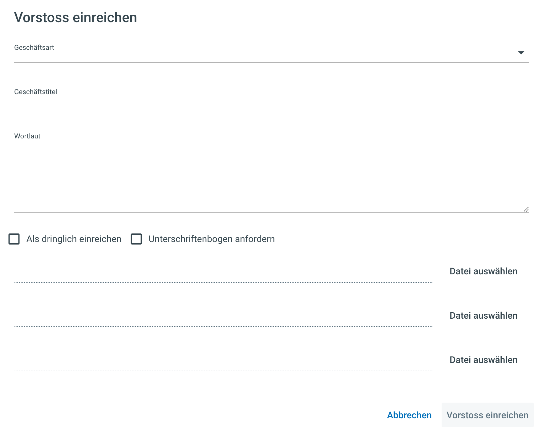 Die Aktion Vorstoss einreichen führt den Benutzer in ein Modal mit einer neuen Maske. Dem Vorstoss kann eine Geschäftsart, ein Geschäftstitel, ein Wortlaut und eine oder mehrere Dateien mitgegeben werden.