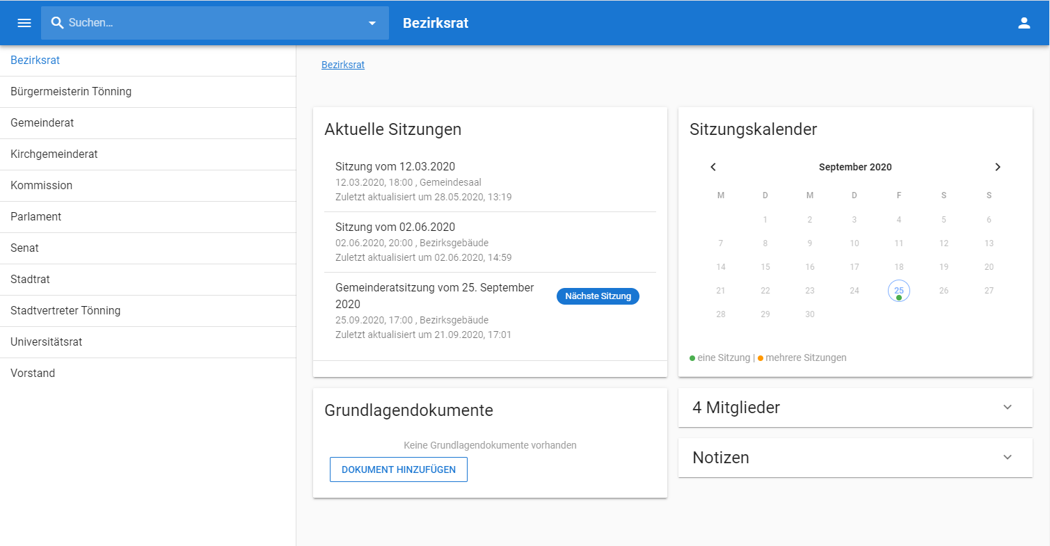 La zone principale affiche les séances en cours, le calendrier des séances, les membres, une zone pour les notes et les documents de base de cet organe.