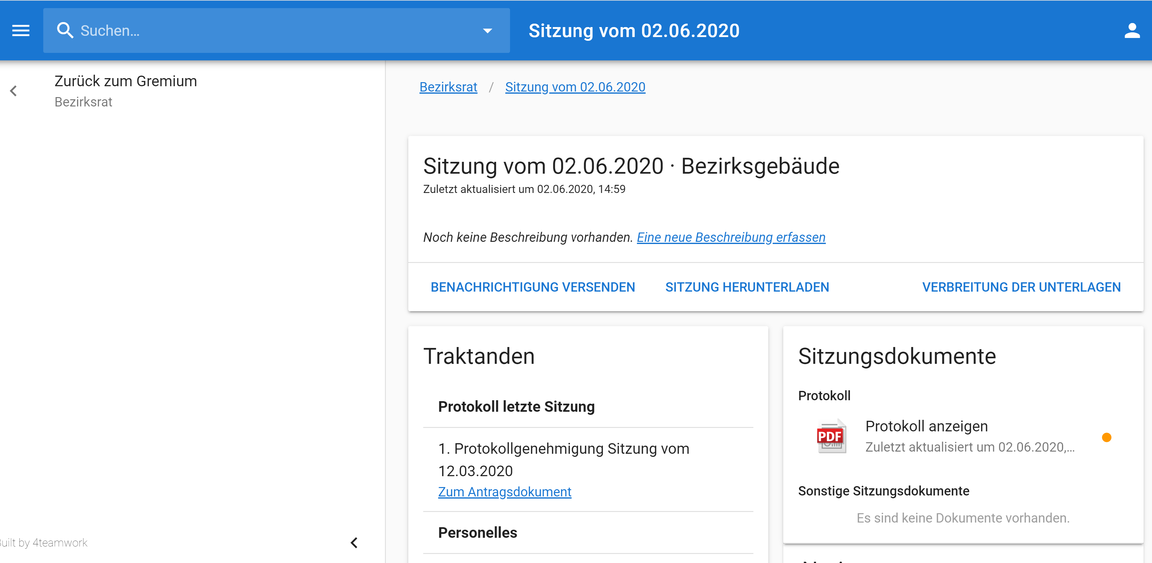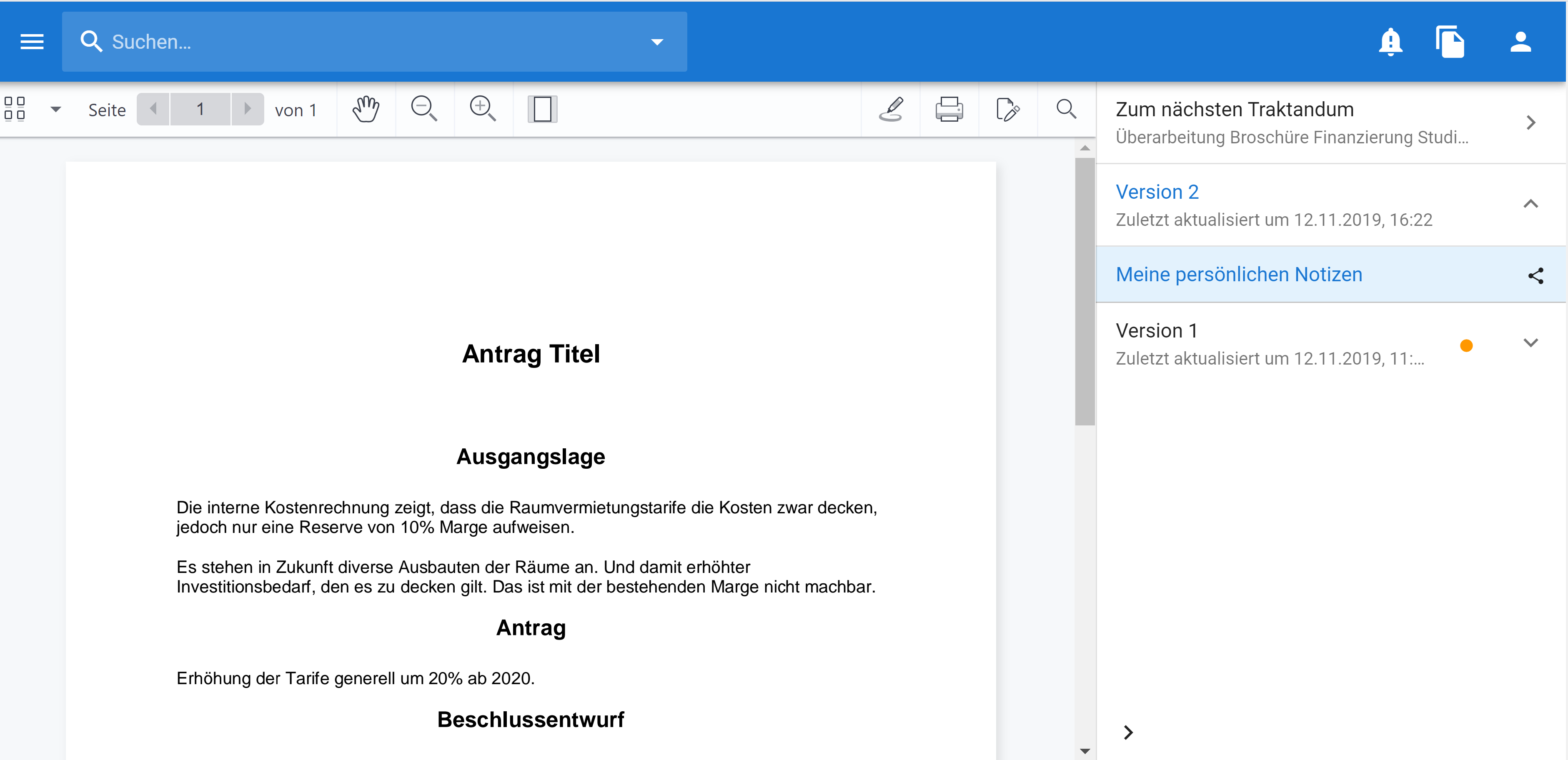 Après avoir cliqué sur un point de l'ordre du jour, les documents associés sont affichés dans une nouvelle vue. À ce niveau, des notes peuvent être prises sur le point de l'ordre du jour et, si nécessaire, partagées avec les collègues. Les documents qui ne sont pas encore ouverts sont marqués d'un point orange. Sur le côté gauche, vous pouvez passer d'un document à l'autre dans le point de l'ordre du jour.