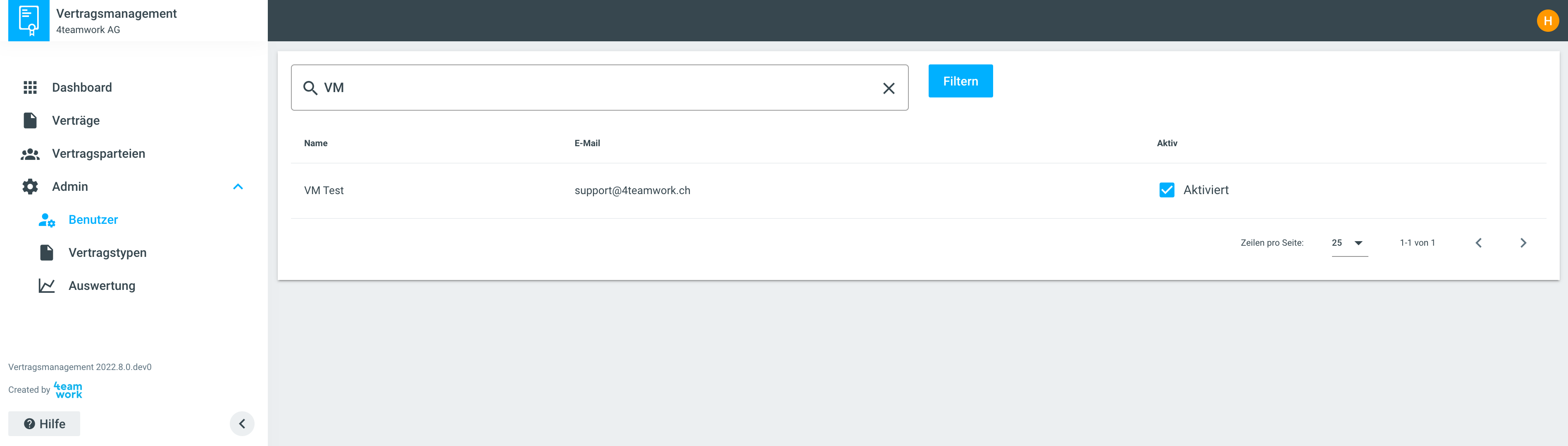 In der Auflistung erscheinen alle User, welche sich vorab mal versucht haben, am Vertragsmanagement anzumelden. Personen mit entsprechender Berechtigung können diese Benutzenden für das Vertragsmanagement aktivieren resp. deaktivieren.