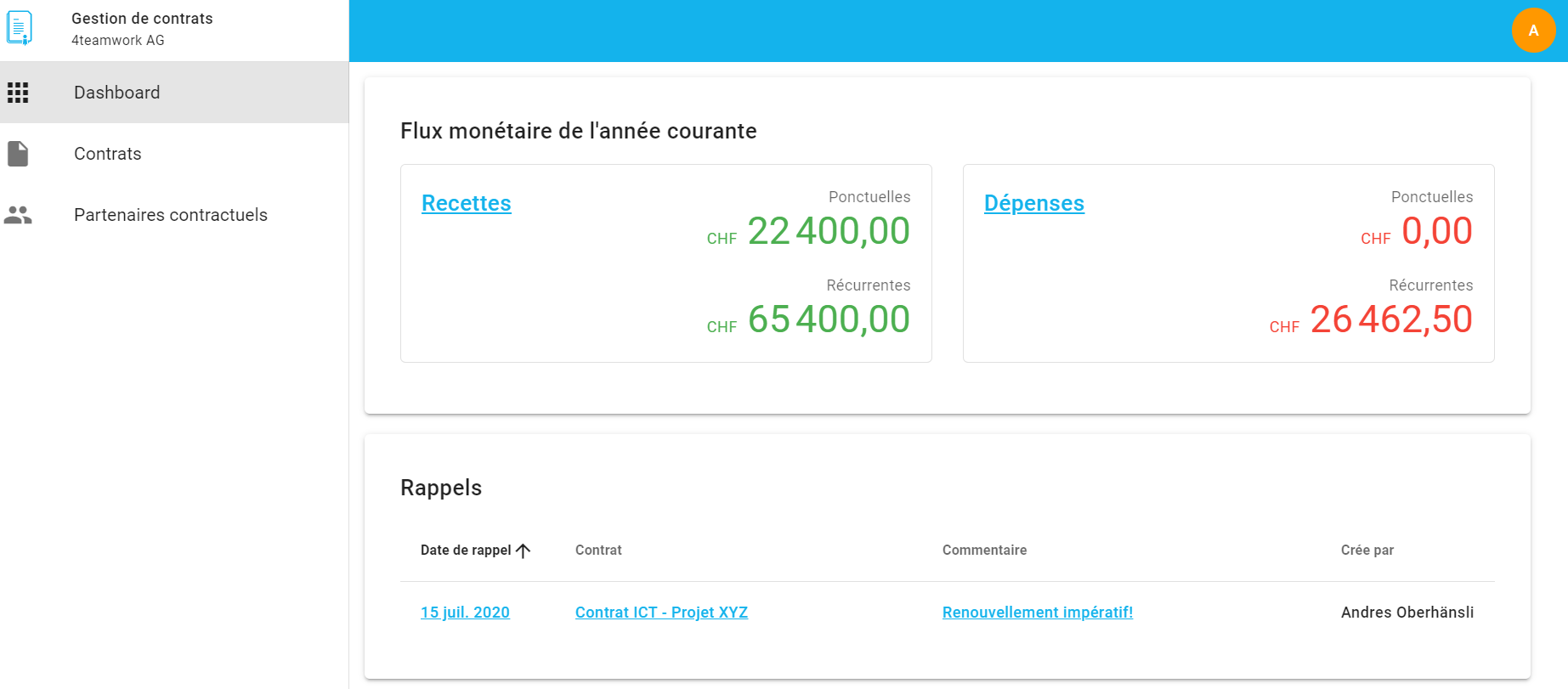 Le tableau de bord offre à l'utilisateur un aperçu rapide des événements contractuels les plus importants et ce de manière proactive, à la manière d'un cockpit.