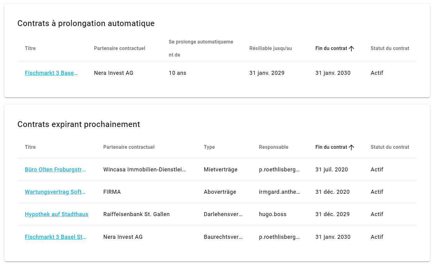 Les contrats à renouvellement automatique sont affichés ici avec, entre autres, la période de renouvellement et la date à laquelle ils peuvent être résiliés.