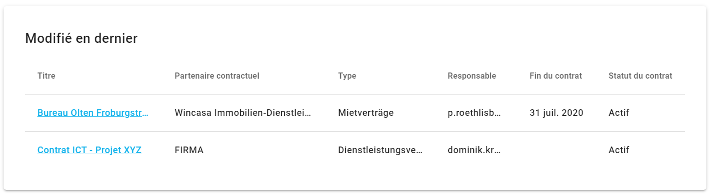 Les derniers contrats modifiés sont affichés ici. Cela implique que les données du contrat ou les documents relatifs au contrat ont été mis à jour ou modifiés.