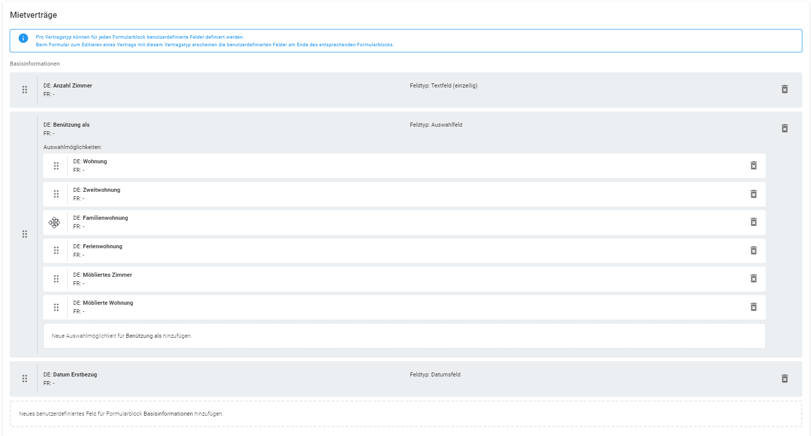 En cliquant sur l'icône d'engrenage, les champs de métadonnées des types de contrats respectifs peuvent être modifiés. Les champs peuvent être placés dans les différents blocs d'information (informations de base, finances, résiliation). En faisant glisser les six points, les éléments individuels peuvent être déplacés.