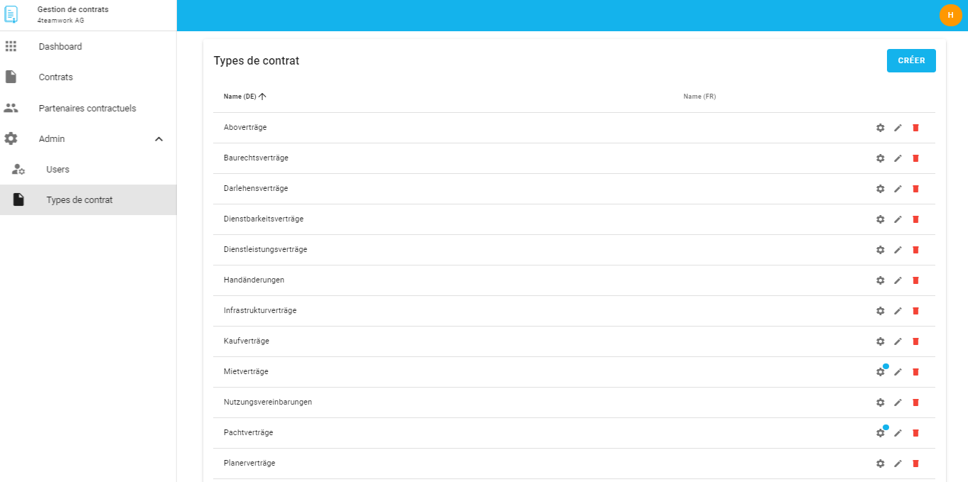 Pour les types de contrats dont l'icône en forme d'engrenage comporte un point bleu, des champs personnalisés supplémentaires ont été ajoutés.