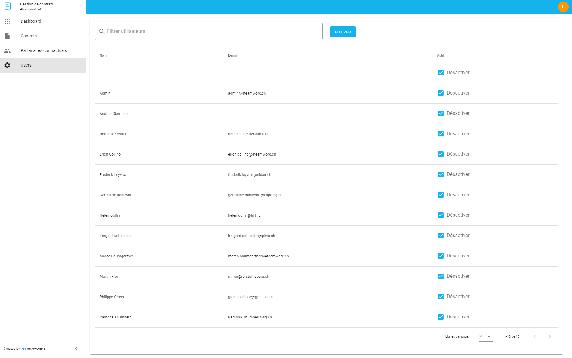 Un quota (nombre d'utilisateurs dans la console d'administration) définit le nombre d'utilisateurs autorisés et est défini individuellement pour chaque installation. Si le quota est épuisé, la personne responsable sera directement informée lors de la demande et le support de 4teamwork sera notifié par e-mail. Il est possible de désactiver des utilisateurs existants au profit d'autres utilisateurs. Ainsi, chaque organisation peut déterminer qui a accès à la gestion de contrats, en fonction de son quota d'utilisateurs.
