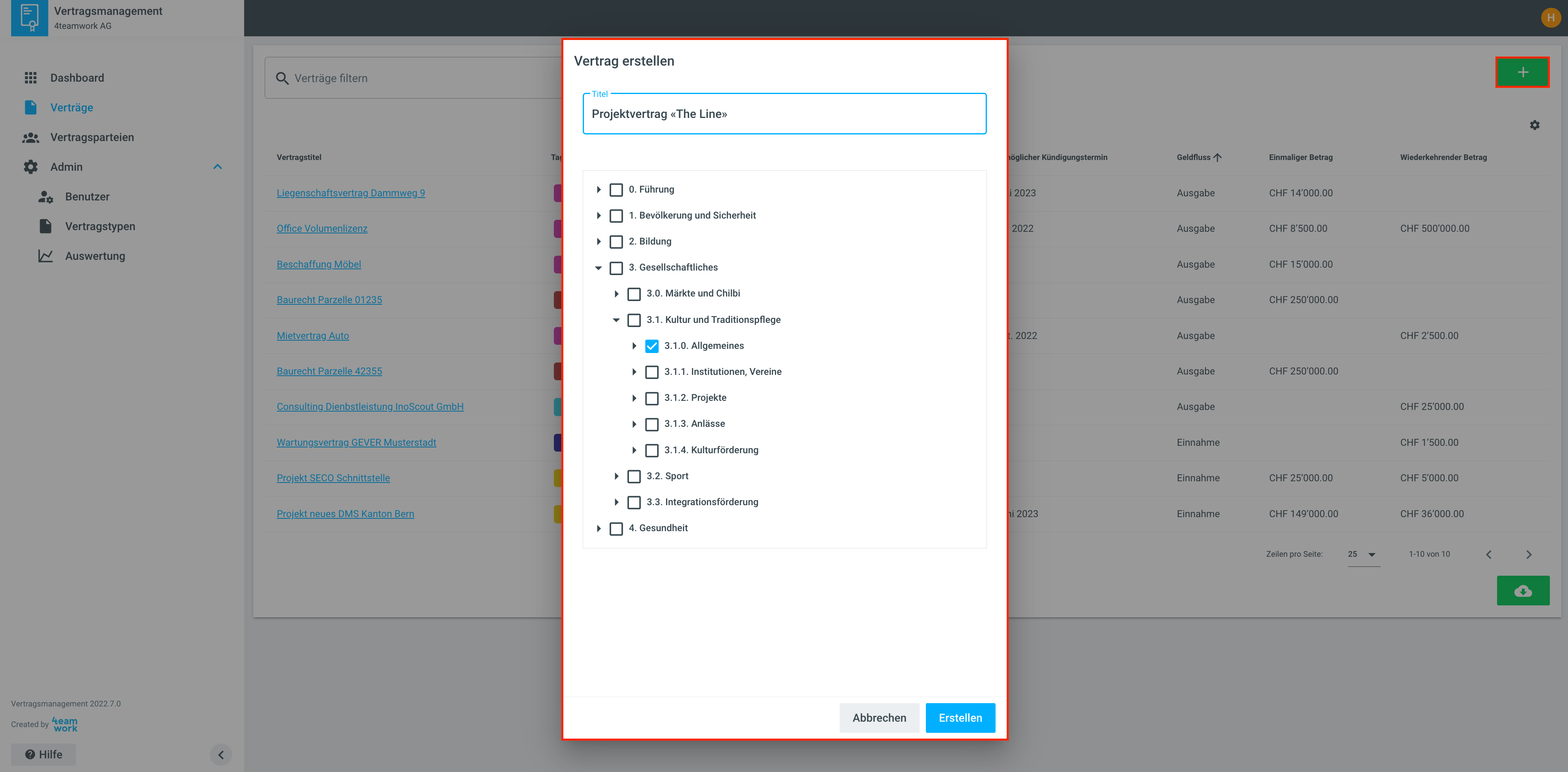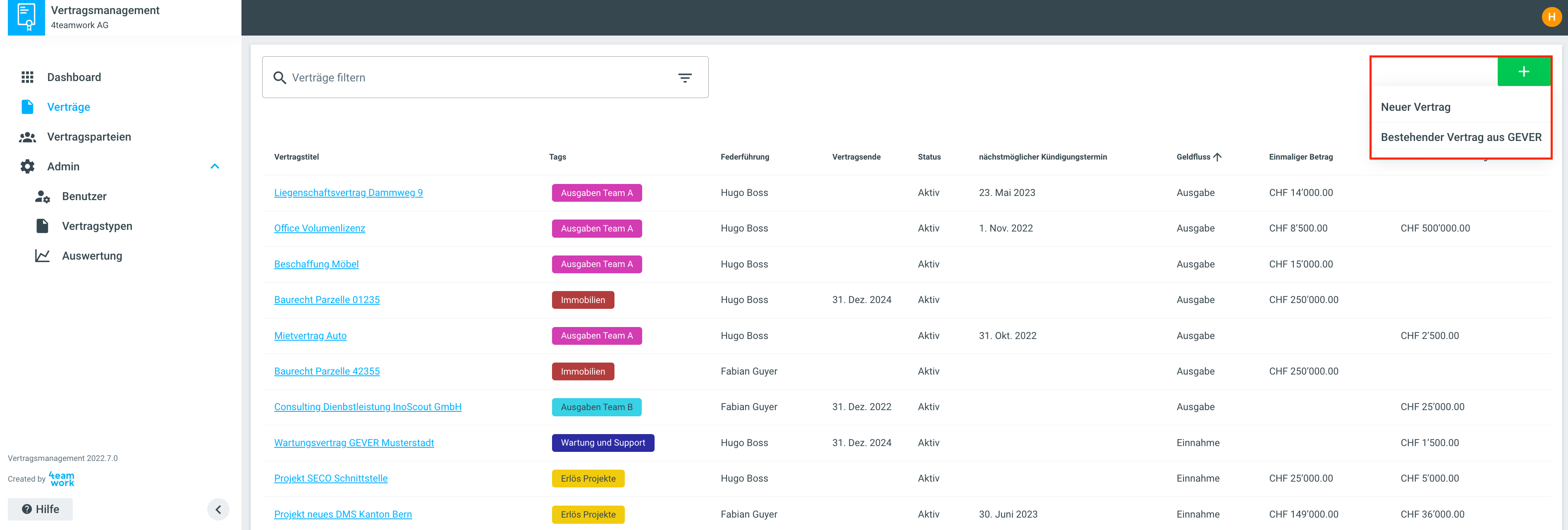Verträge können hier auf zwei Arten erfasst werden. Soll ein neuer Vertrag im Vertragsmanagement erfasst werden, kann dies über das Plus-Symbol und Klick auf Neuer Vertrag erledigt werden.