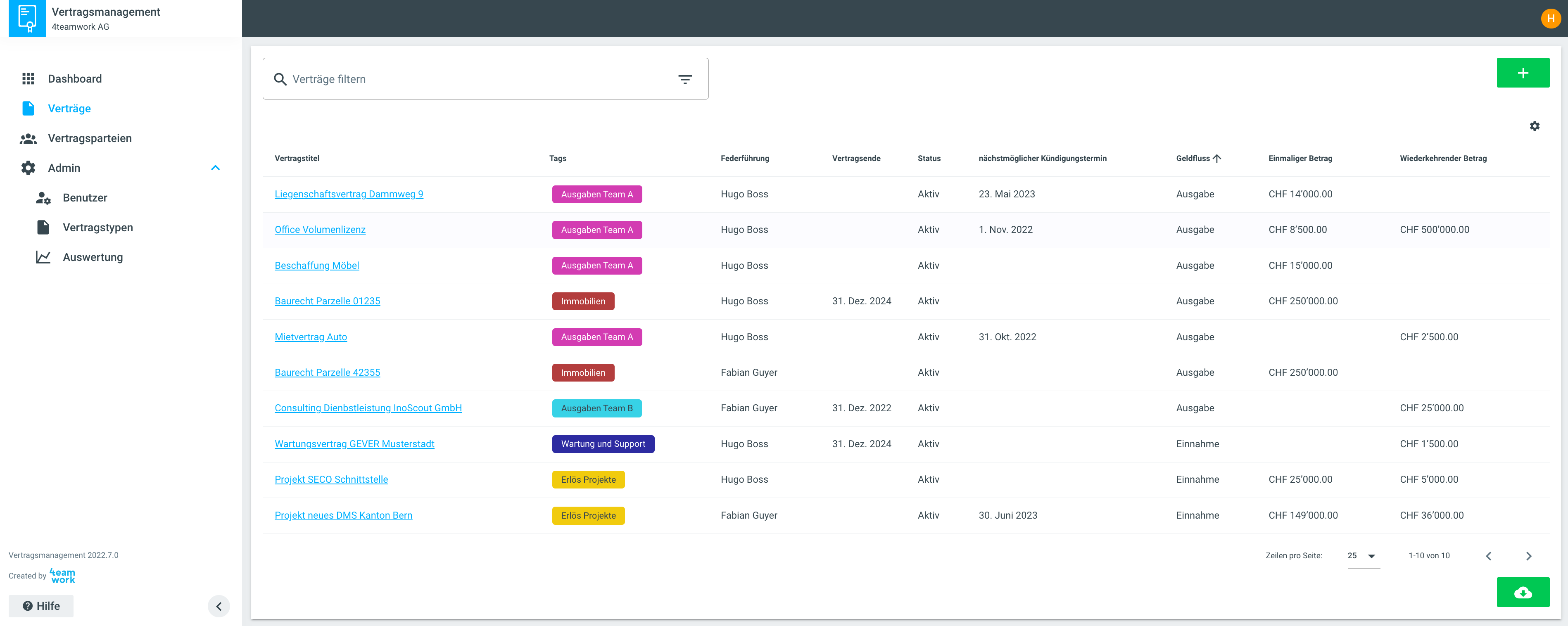 Unter dem Menü-Punkt Verträge werden die erfassten Verträge aufgelistet, auf die/der Benutzende in GEVER auch zugreifen kann. Die Berechtigungen auf die Verträge werden vom GEVER übernommen.