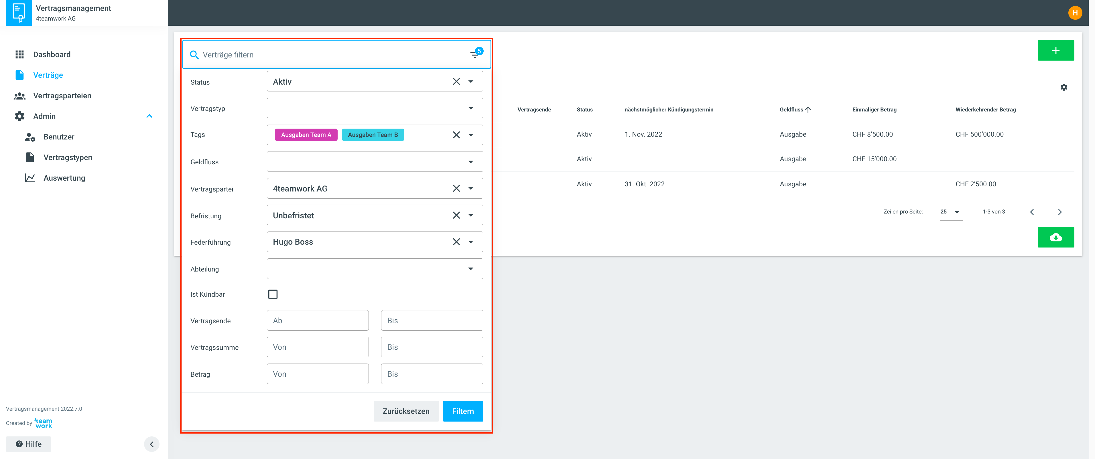 Suchen / Filtern der Verträge