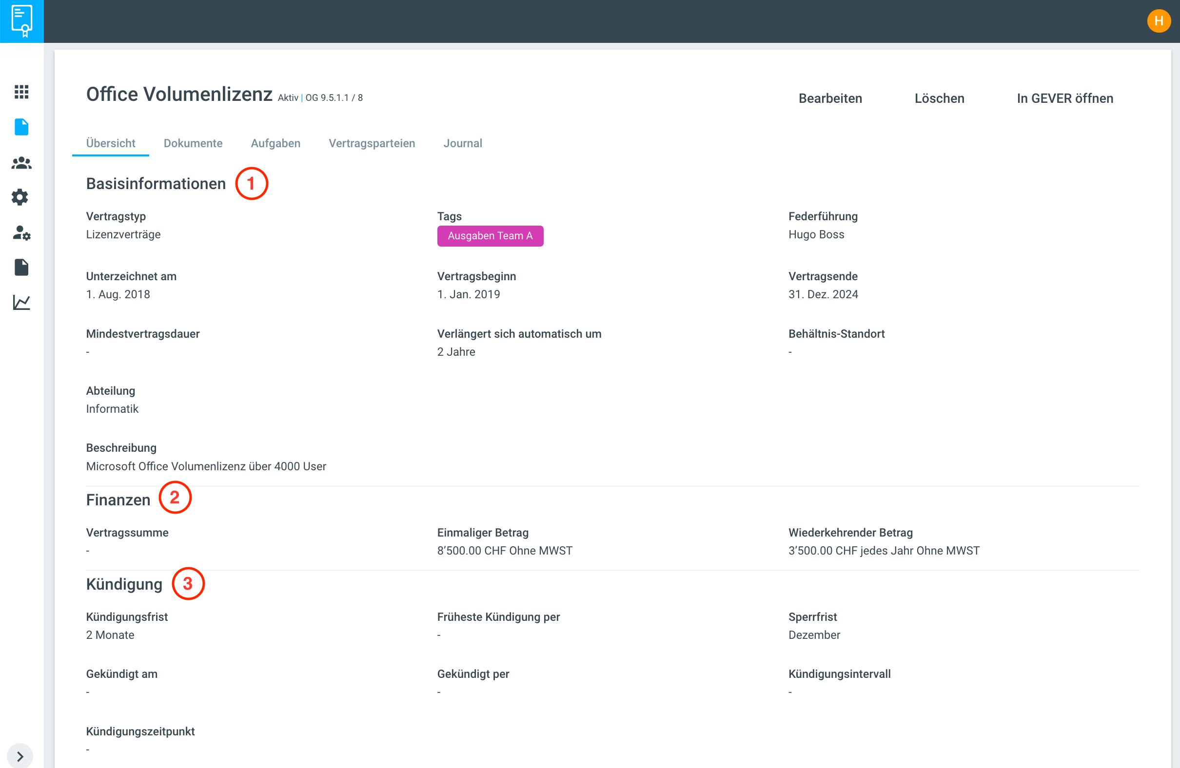 Wenn ein Vertrag geöffnet wird, gelangt man direkt auf das Register Übersicht, wo die Vertragsdaten erfasst werden können. Die Ansicht ist aufgeteilt in die Bereiche Basisinformationen (1), Finanzen (2) und Kündigung (3).