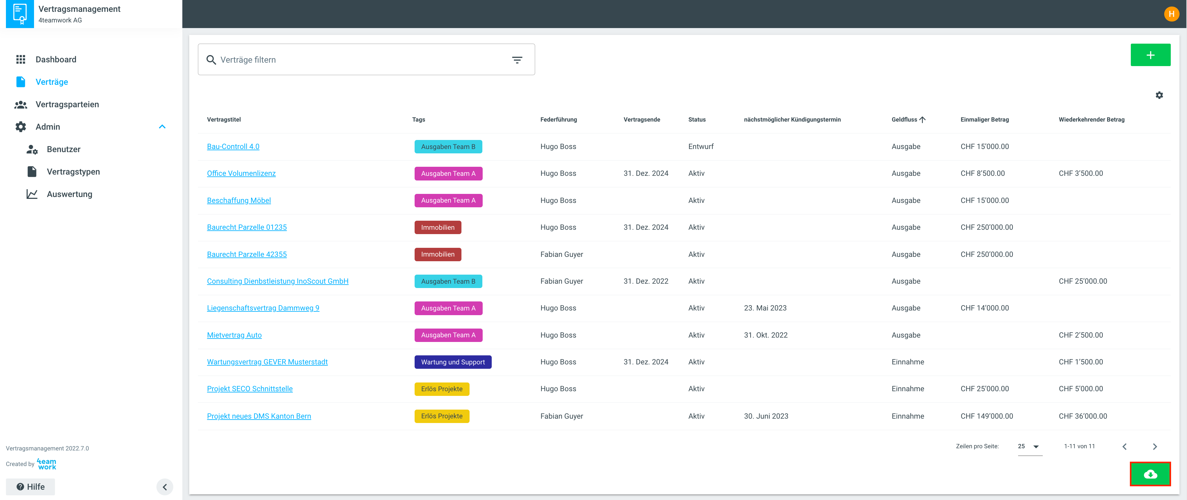 Über das Wolken-Symbol am Listenende kann die Ansicht der Verträge exportiert werden. Es wird ein Excel mit allen Metadaten des Vertrags erstellt und heruntergeladen.