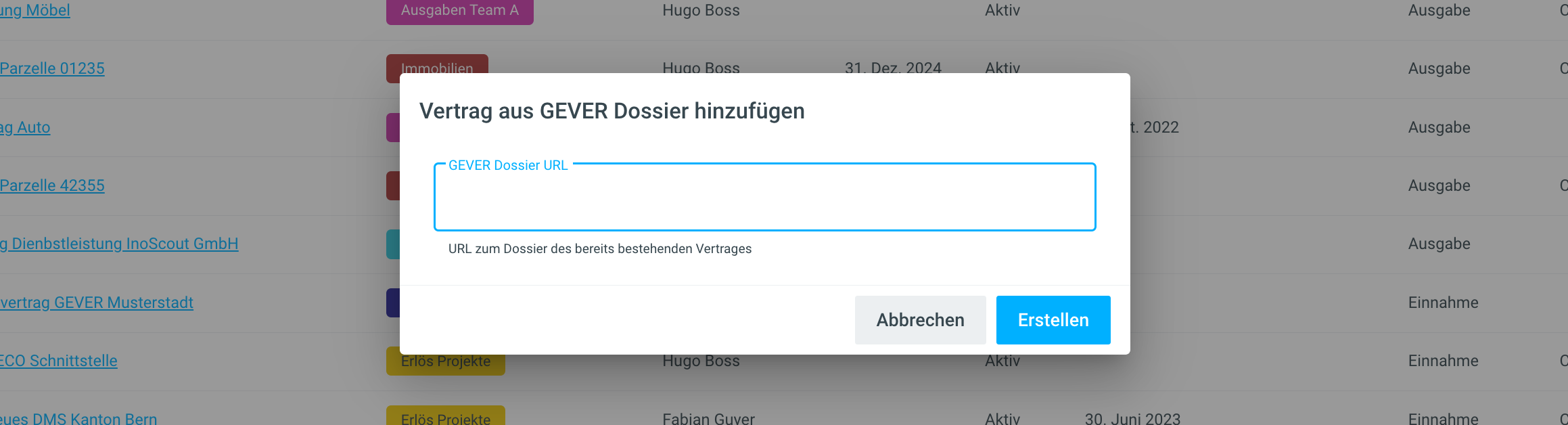 Durch das Einfügen der URL des bestehenden Vertrags-Dossier aus GEVER und dem Bestätigen über die Aktion Erstellenwird der Vertrag erstellt. Das System verknüpft den Vertrag automatisch mit dem eingefügten GEVER-Dossier.
