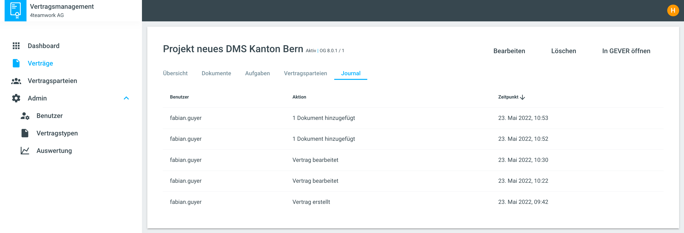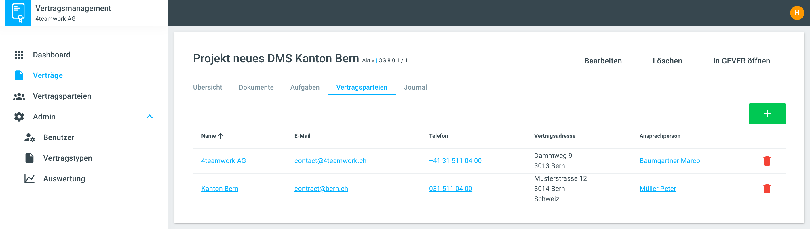 Verträge können bearbeitet, gelöscht und in GEVER geöffnet werden.