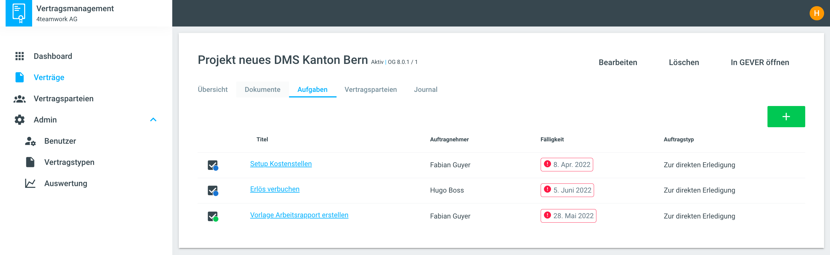 Hier werden alle Aufgabe aus dem Vertragsdossier mit den wichtigsten Metadaten aufgelistet.