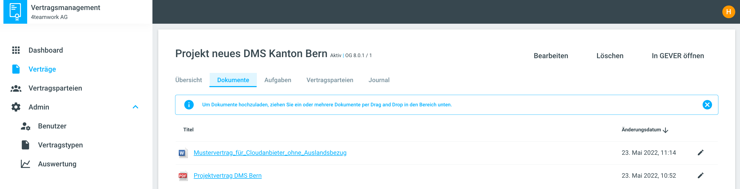 Die Dokumente liegen im entsprechenden Vertragsdossier im GEVER und werden im Vertragsmanagement nur angezeigt.